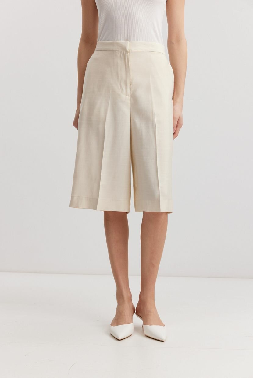 Женские шорты-бермуды из структурной смесовой вискозной ткани с лёгким блеском (90% вискозы и 10% полиэстера). Дышащий материал с включением натуральных волокон обеспечивает комфорт для кожи и свободу движений. Модель предусматривает свободный крой и среднюю посадку, потайную застежку на крючок и пуговицу на откоске. Передние наклонные карманы добавляют практичности и функциональности, а задние фальшкарманы аккуратно уравновешивают образ. Шорты идеально подходят для повседневных кэжуал образов, а также офисных аутфитов с нестрогим дресс-кодом на лето, благодаря однотонной ткани базовых оттенков и заутюженным стрелкам, отсылающим к элегантности классики. Доступны в больших размерах. Рекомендуется бережная стирка при температуре не более 30°C для сохранения качества ткани.