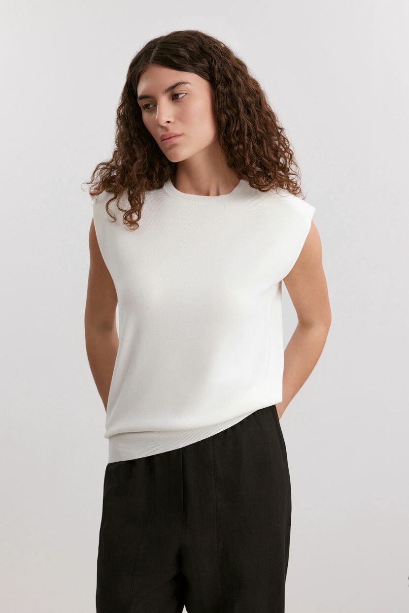 Женский топ из мягкой и упругой смесовой вискозы (80% вискозы и 20% полиамида). Материал обеспечивает комфорт, эластичность и формоустойчивость благодаря смеси натуральных и синтетических нитей. Удлиненный топ с плечевыми накладками имеет гладкое переплетение основного полотна, а также отделку манжет и горловины в рубчик, правильно расставляющую модные акценты. Он не имеет рукавов, что делает его идеальным для теплой погоды. Стильный топ можно носить под пиджак или кардиган, а также в качестве самостоятельного элемента гардероба. Подходит для деловых офисных и повседневных кэжуал образов. Обладает свободным, умеренным оверсайз силуэтом, выгодно подчеркивает фигуру и создает модный образ. Благодаря воздушному материалу станет незаменимой частью женского гардероба для теплого сезона. Стильный топ отлично подойдет для высокого роста и представлен в больших размерах. Станет более нежной и элегантной заменой футболкам, он универсален для аутфитов на любой случай. Классическая закрытая полочка делает его универсальным элементом гардероба, уместным как для работы в офисе, так и для прогулок, свиданий, вечерних мероприятий. Рекомендуем ручную стирку при t не более 30°C