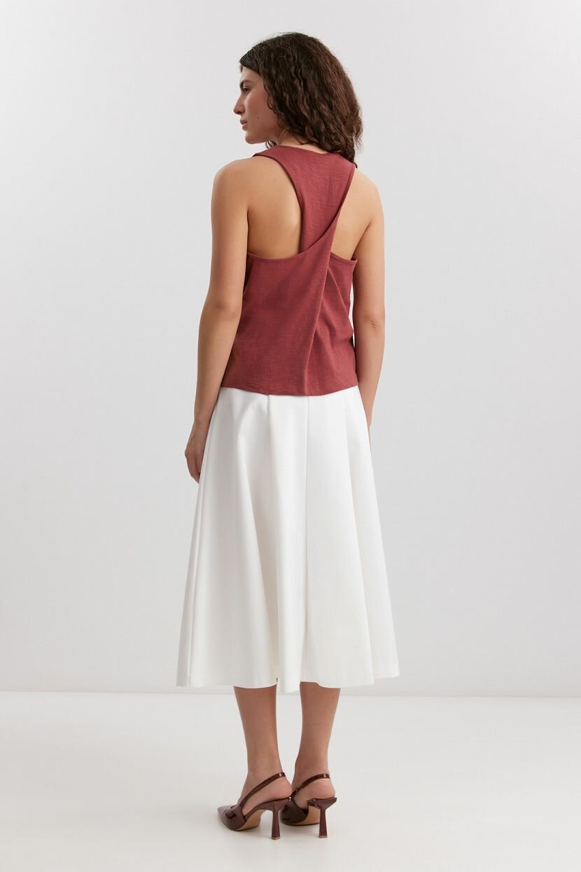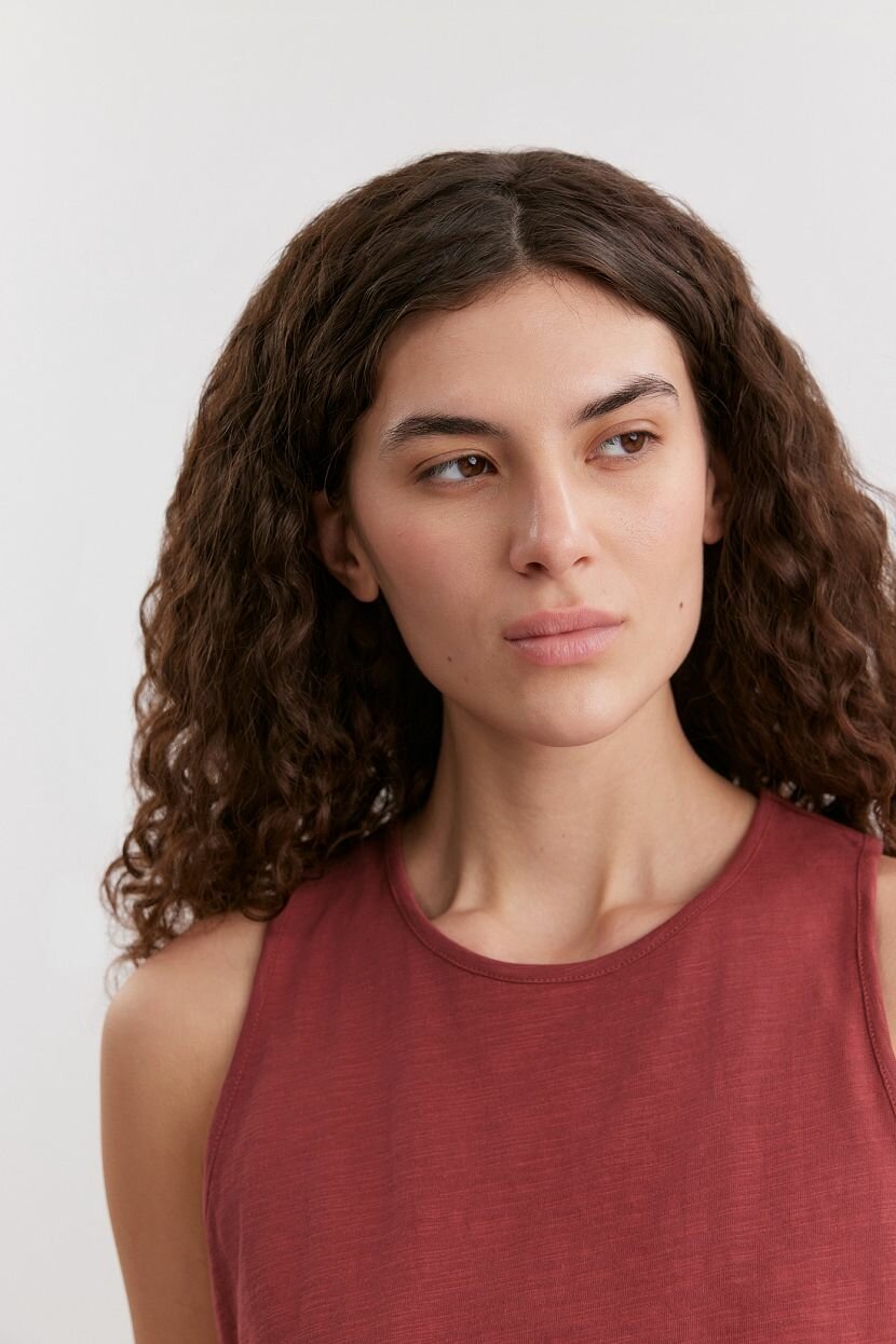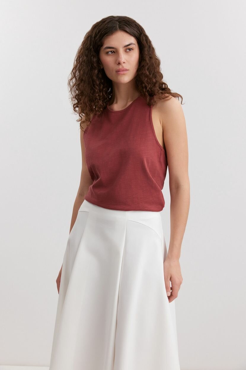 Женский топ из 100% хлопкового поплина. Лёгкая дышащая ткань слаб-джерси обеспечивает приятные тактильные ощущения и комфорт в тёплый весенне-летний период. Модель имеет полуприлегающий силуэт и длину до бедра, подчёркивает женственность фигуры и обеспечивает свободу движений. Круглый вырез и отсутствие рукавов делают топ комфортным даже в жару. Особенности модели — перекрученный элемент на спине, проймы в стиле борцовки и драпировка. Подходит для высоких женщин, доступна в больших размерах. Универсально стилизуется как в повседневных образах в стиле кэжуал, так и в деловых офисных аутфитах. Рекомендуется ручная стирка при температуре не более 30°C для сохранения качества ткани.