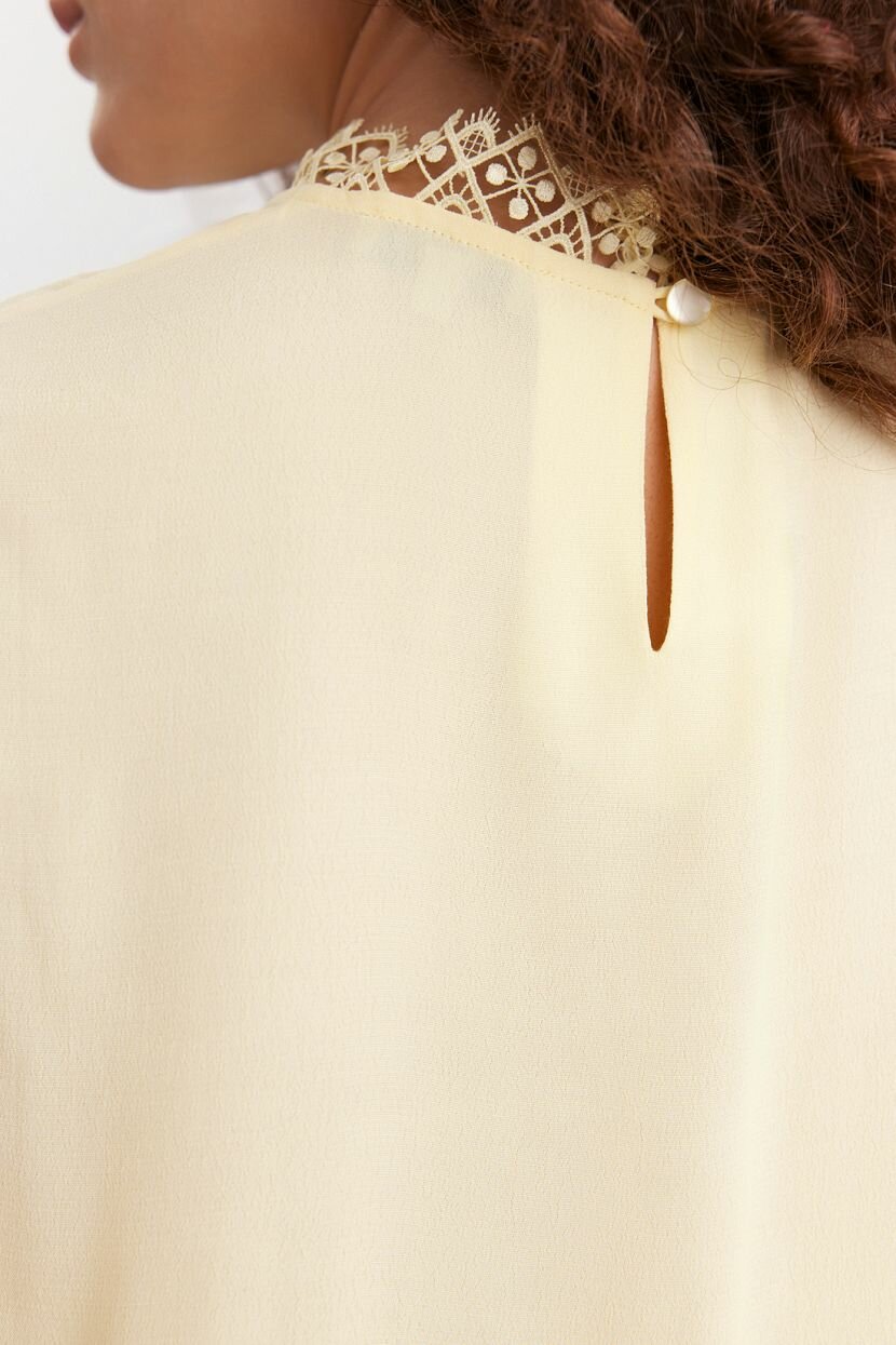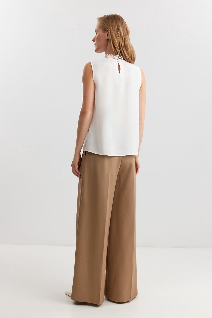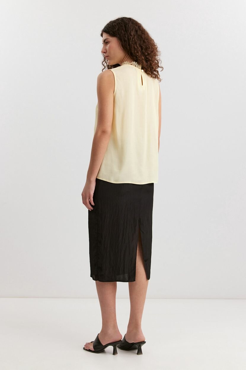 Женский топ прямого силуэта из креповой 100% вискозы. Дышащий натуральный материал обеспечивает комфорт для кожи и свободу движений. Модель имеет воротник-стойку из фактурного кружева для более романтичного элегантного образа. Топ без рукавов из легкой воздушной ткани, с застежкой на пуговицу по спинке, идеально подходит для летнего и весеннего гардероба. Основное однотонное полотно из гладкого текстиля и длина до бедра — такая модель органично сочетается с повседневными кэжуал и деловыми офисными аутфитами. Топ доступен в больших размерах и подходит для высоких девушек. Рекомендуется бережная стирка при температуре не более 30°C для сохранения качества ткани.