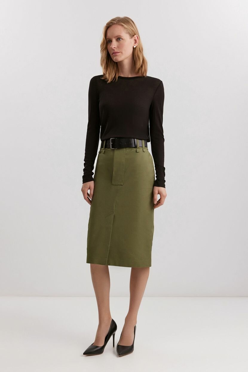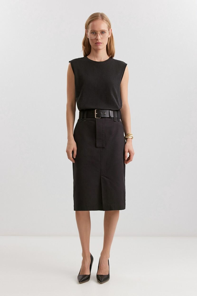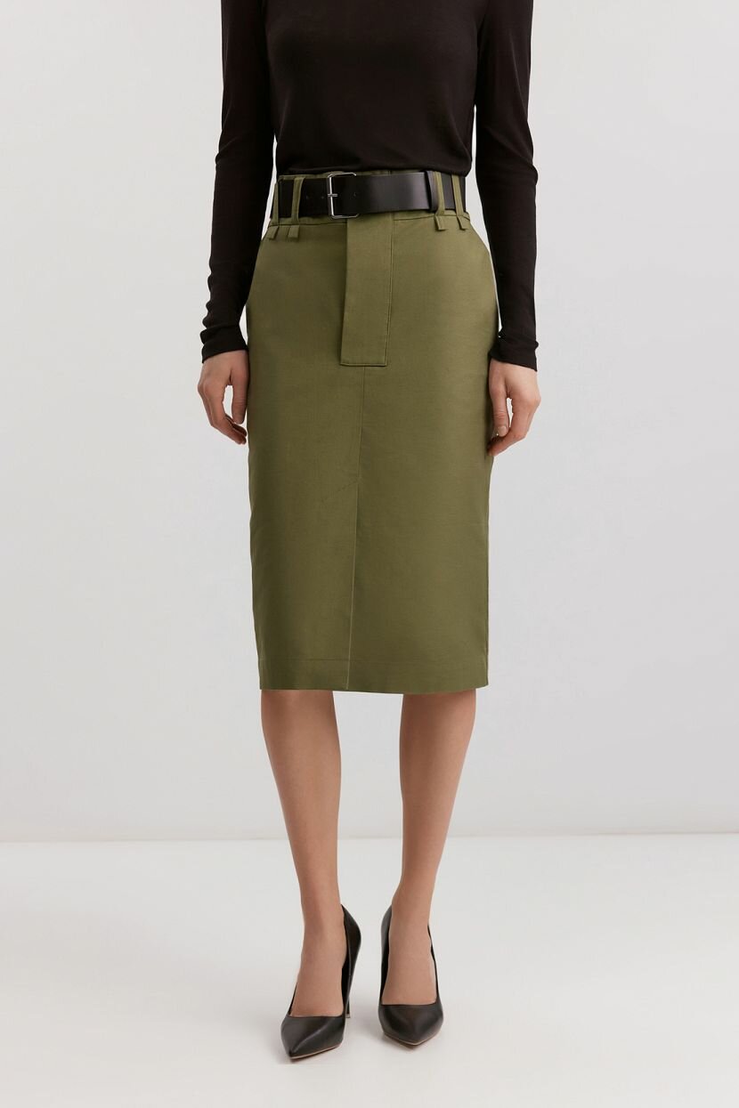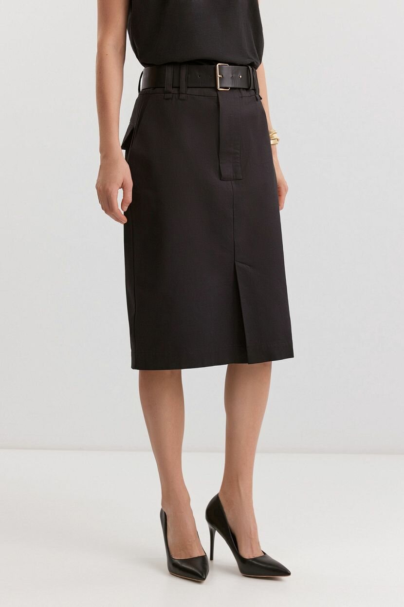 Женская юбка длины миди с акцентной планкой на гульфике выполнена из структурной смесовой ткани (в составе основной ткани 89% хлопка и 11% льна, подкладка из 45% вискозы и 55% полиэстера). Дышащий материал обеспечивает комфорт и свободу движений. Модель прямого кроя со средней посадкой и длиной до колена оснащена наклонными боковыми карманами, разрезом по переду и фальшкарманами сзади. Застежка на молнию, пояс из основной ткани, сатиновая отделка и базовые оттенки делают юбку идеальным выбором как для повседневных, так и для офисных деловых аутфитов в кэжуал стиле. Доступна в больших размерах. Рекомендуется бережная стирка при температуре не более 30°C для сохранения качества ткани.