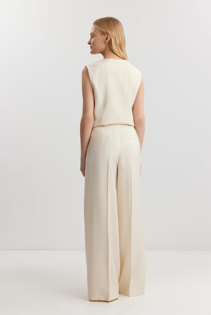 Женские брюки из структурной смесовой вискозной ткани с легким блеском (90% вискозы и 10% полиэстера). Модель прямого кроя с комбинированной застежкой на молнию и крючки. Передние наклонные карманы добавляют удобства и практичности, а задние фальшкарманы и заутюженные стрелки аккуратно завершают образ и добавляют элегантности. Брюки идеально подходят для весеннего и летнего гардероба, универсально дополнят как аутфиты для офиса, так и повседневные кэжуал. Широкие брючины свободного кроя обеспечивают комфорт и свободу движений. Доступны в больших размерах и подходят для женщин высокого роста. Рекомендуем бережную стирку при температуре не более 30°C.