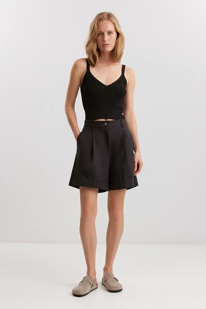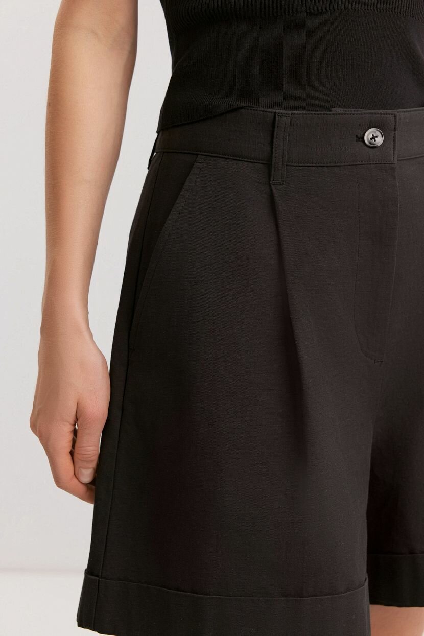 Женские шорты из структурной смесовой ткани — 11% льна и 89% хлопка. Дышащий материал обеспечивает комфорт и свободу движений. Модель имеет прямой крой и среднюю посадку, оснащена потайной застежкой на крючок и пуговицу на откоске, наклонными передними карманами и задними фальшкарманами. Манжеты и заутюженные стрелки отсылают к элегантности классики. Основное полотно из текстильного гладкого трикотажа, подкладка не предусмотрена. Шорты отлично стилизуются в повседневных кэжуал аутфитах на весну и лето для прогулок и свиданий. Доступны в больших размерах. Рекомендуется бережная стирка при температуре не более 30°C для сохранения качества ткани.