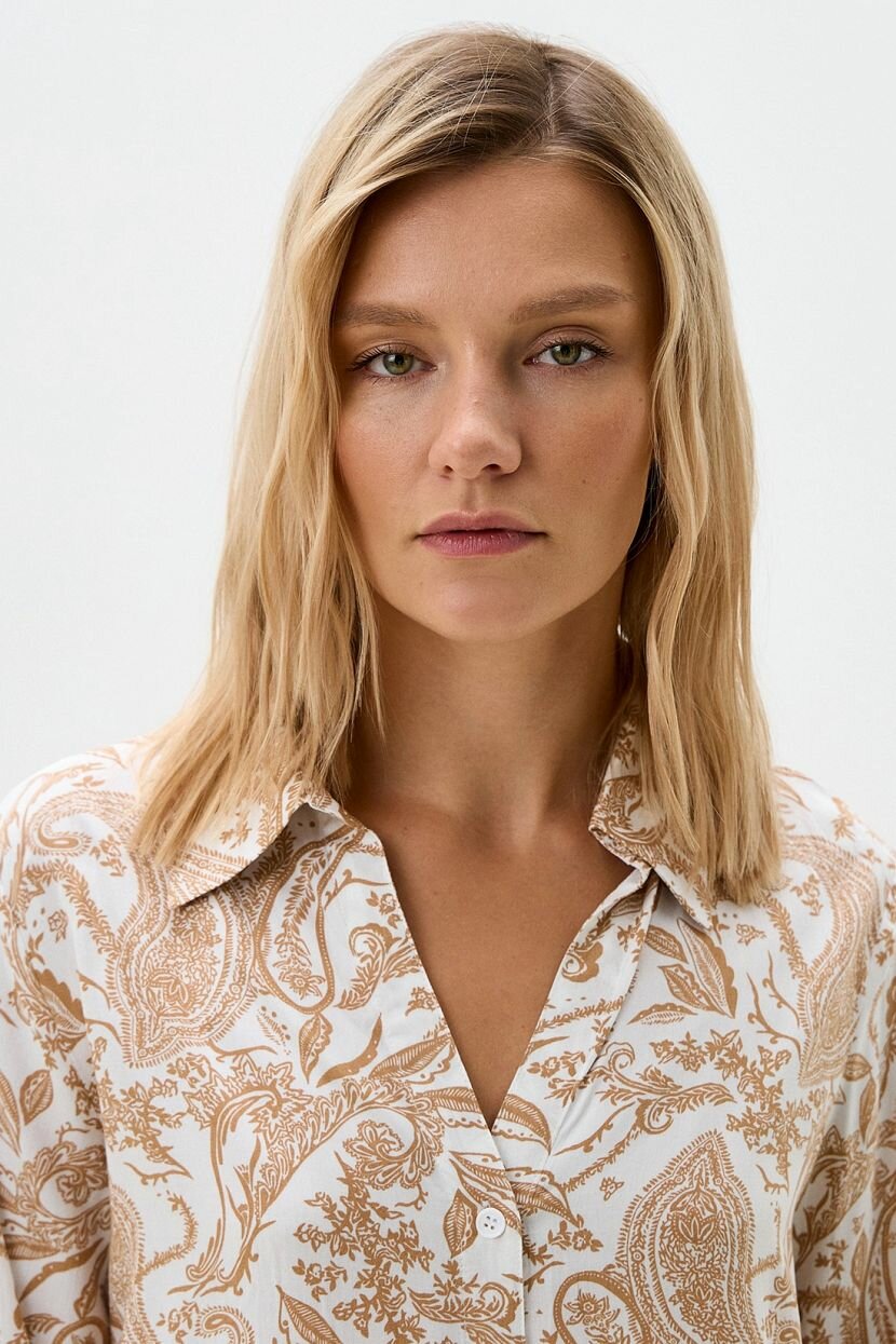 Женская блузка из 100% вискозы, обеспечивающей мягкость и комфорт в носке. Дышащий натуральный материал делает модель идеальной для теплых летних и весенних дней. Рубашечный крой и свободная посадка создают стильный удобный образ. Повседневная блузка без подкладки оснащена пуговицами и отложным воротником, а V-образный вырез добавляет элегантности. Длинные рукава и длина до бедра обеспечивают комфорт в повседневной носке, а гладкая текстура ткани с орнаментом придает изделию уникальный внешний вид. Блузка подходит для высоких женщин и доступна в больших размерах, что делает её универсальной для различных типов фигуры. Эта женская рубашка станет отличным дополнением женского гардероба для офиса и повседневных образов. Рекомендуется бережная стирка при температуре не более 30°C для сохранения качества ткани.