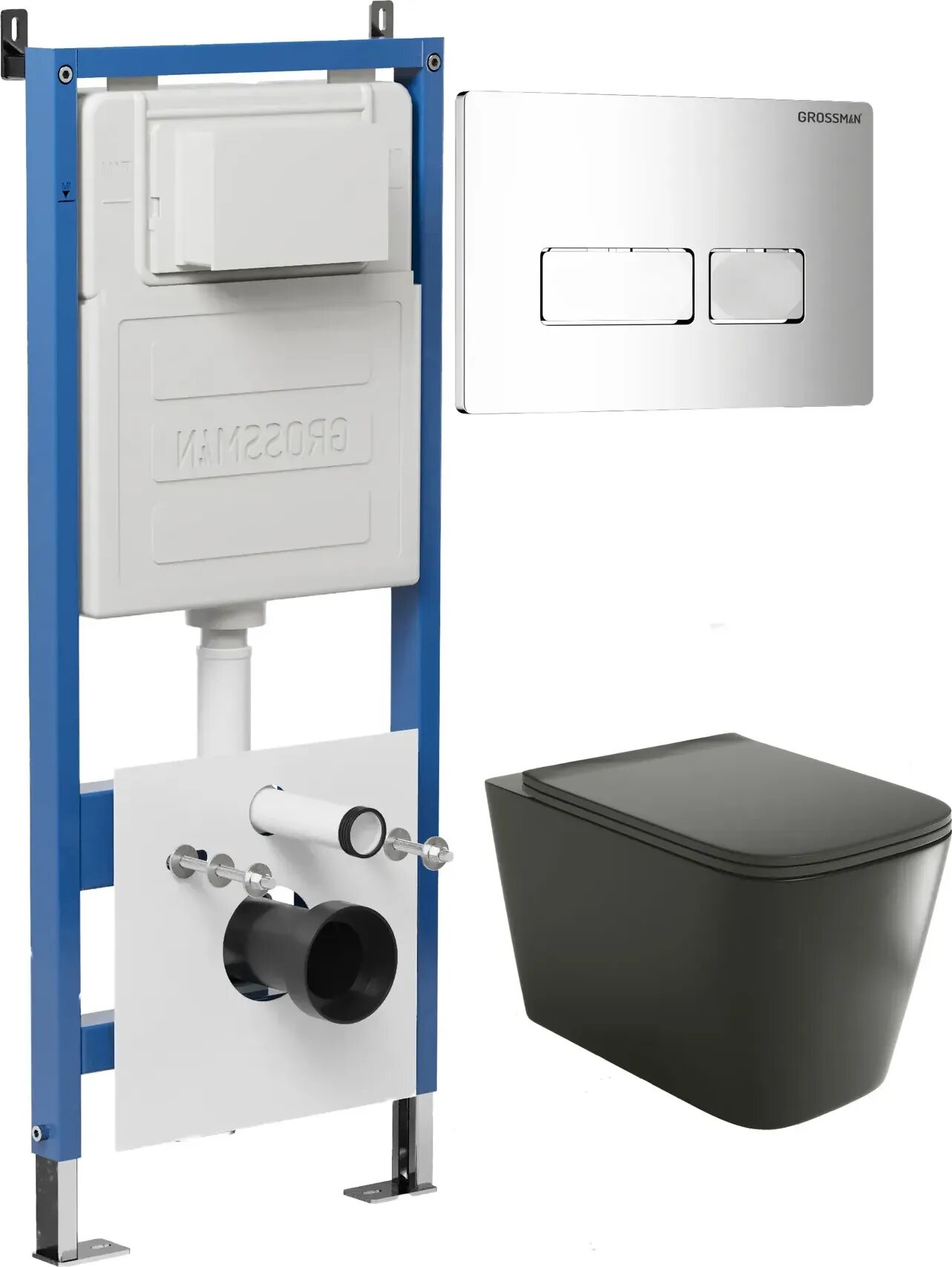 Комплект Унитаз подвесной с инсталляцией Grossman Pragma 97.4441BMS.03.100 безободковый, черный матовый + Кнопка смыва хром глянцевый