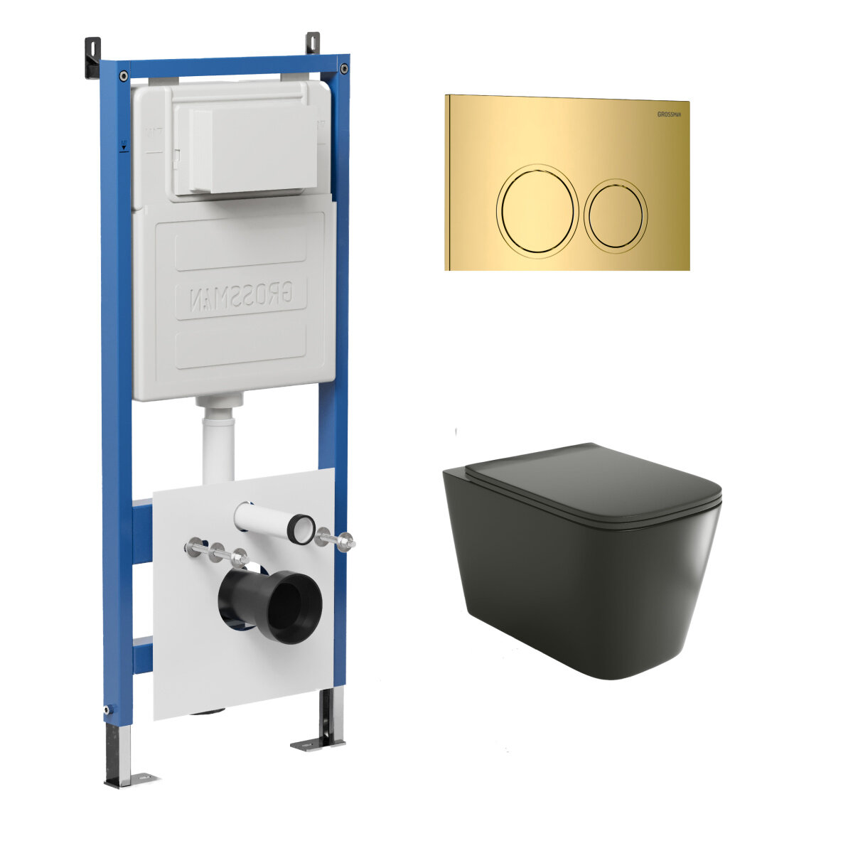 Комплект Унитаз подвесной с инсталляцией Grossman Galaxy 97.4441BMS.01.300 безободковый, черный матовый + Кнопка смыва золото глянцевое