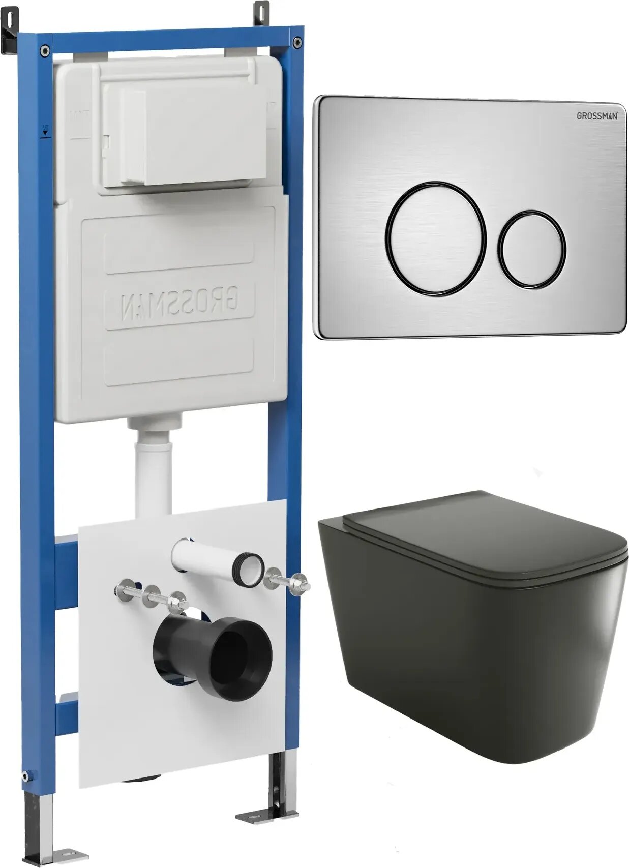Комплект Унитаз подвесной с инсталляцией Grossman Style 97.4441BMS.05.12M безободковый, черный матовый + Кнопка смыва хром сатиновый