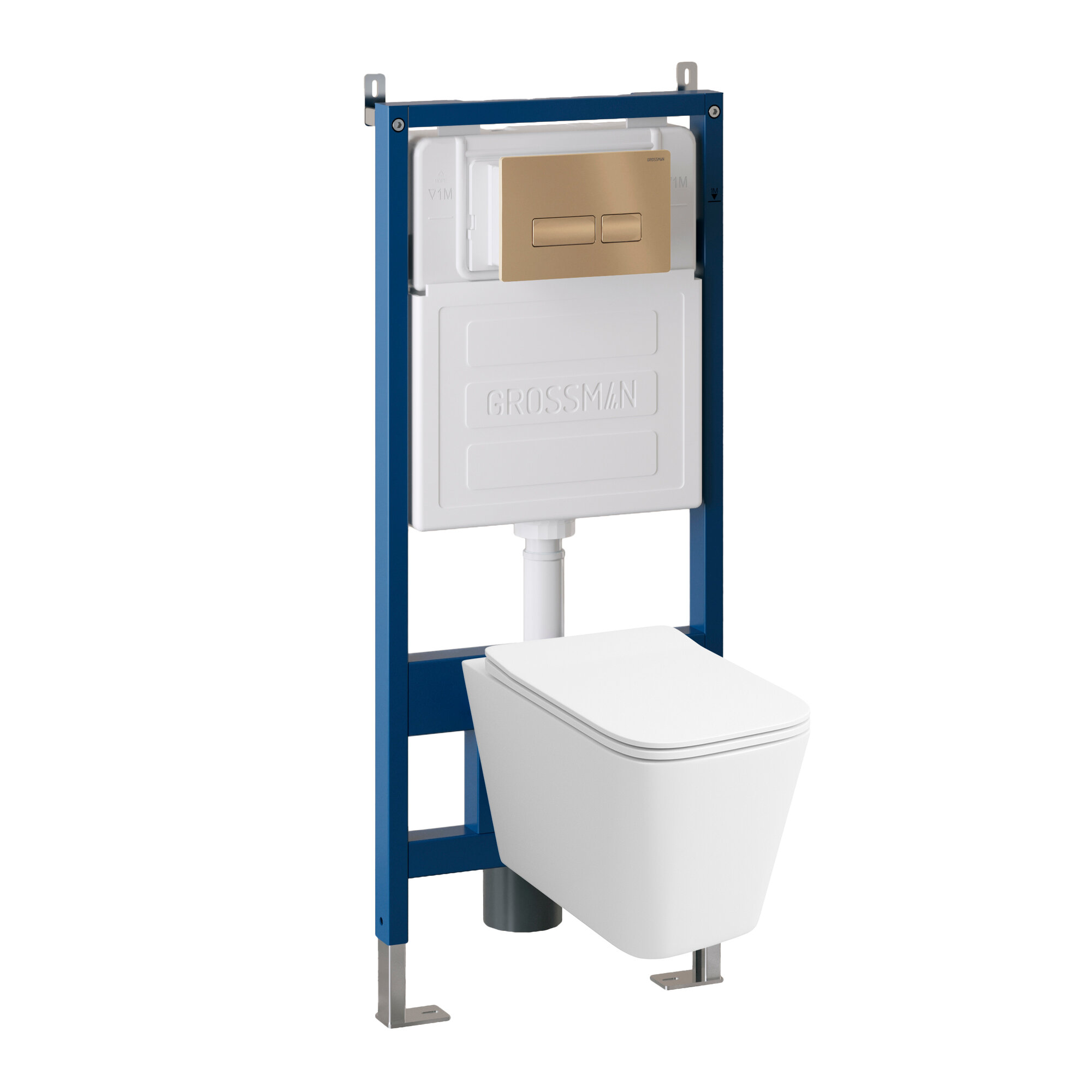 Комплект Унитаз подвесной с инсталляцией Grossman Pragma 97.4478BMS.03.310 безободковый, черный матовый + Кнопка смыва золото матовое