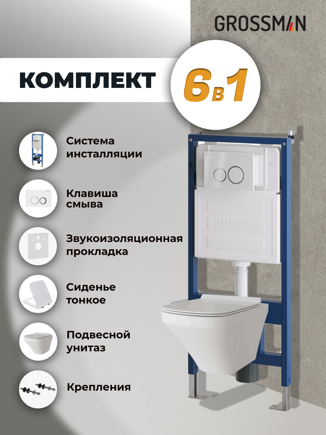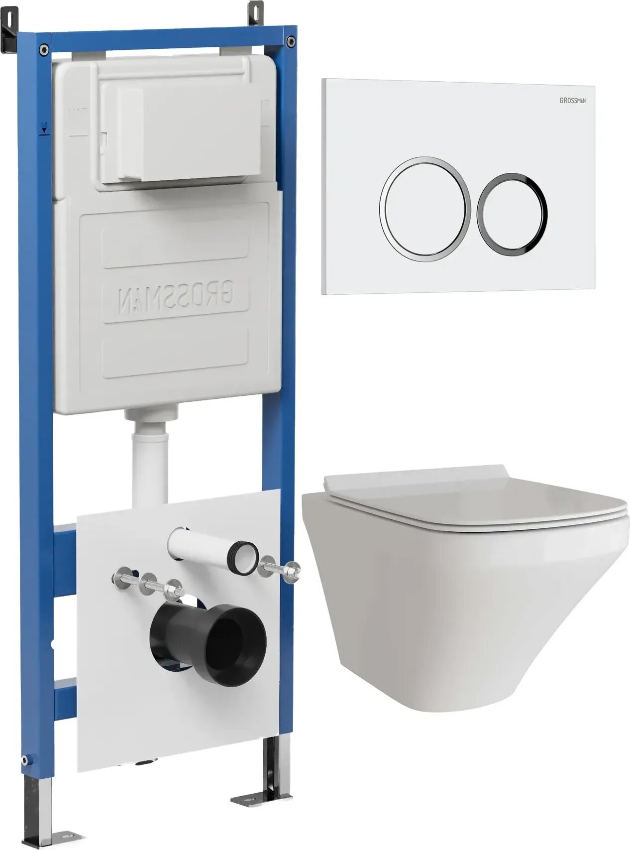 Комплект Унитаз подвесной с инсталляцией Grossman Galaxy 97.4440S.01.000 безободковый, белый + Кнопка смыва белая