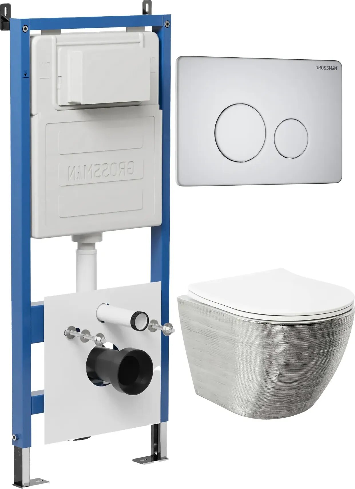 Комплект Унитаз подвесной с инсталляцией Grossman Style 97.4455SWS.05.01M безободковый, серебро+ Кнопка смыва белая матовая