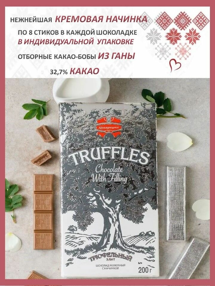 Тёмный шоколад с нежной трюфельной начинкой и тонким ароматом ванили. Содержание какао-продуктов в шоколадной массе не менее 47,0%.