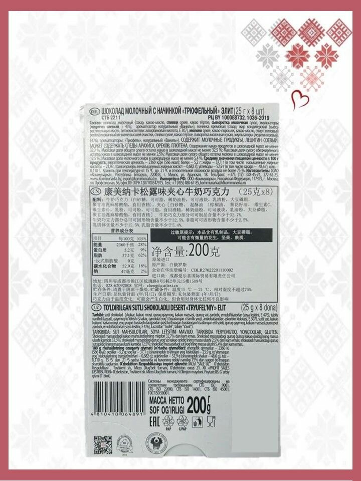 | Состав | Шоколад темный (сахар, какао тёртое, какао-масло, эмульгаторы (лецитин соевый, Е 476), ароматизатор натуральный "Ваниль"), начинка кремовая (сахар, жир кондитерский (смесь растительных масел, антиокислители: аскорбиновая кислота, Е 307), молоко сухое, какао-порошок, какао тёртое, спирт этиловый ректификованный не ниже высшей очистки, какао-масло, эмульгаторы (лецитин соевый, Е 476), ароматизатор "Трюфель"). Содержит молочные продукты, лецитин соевый. Может содержать следы арахиса, орехов, глютена. |