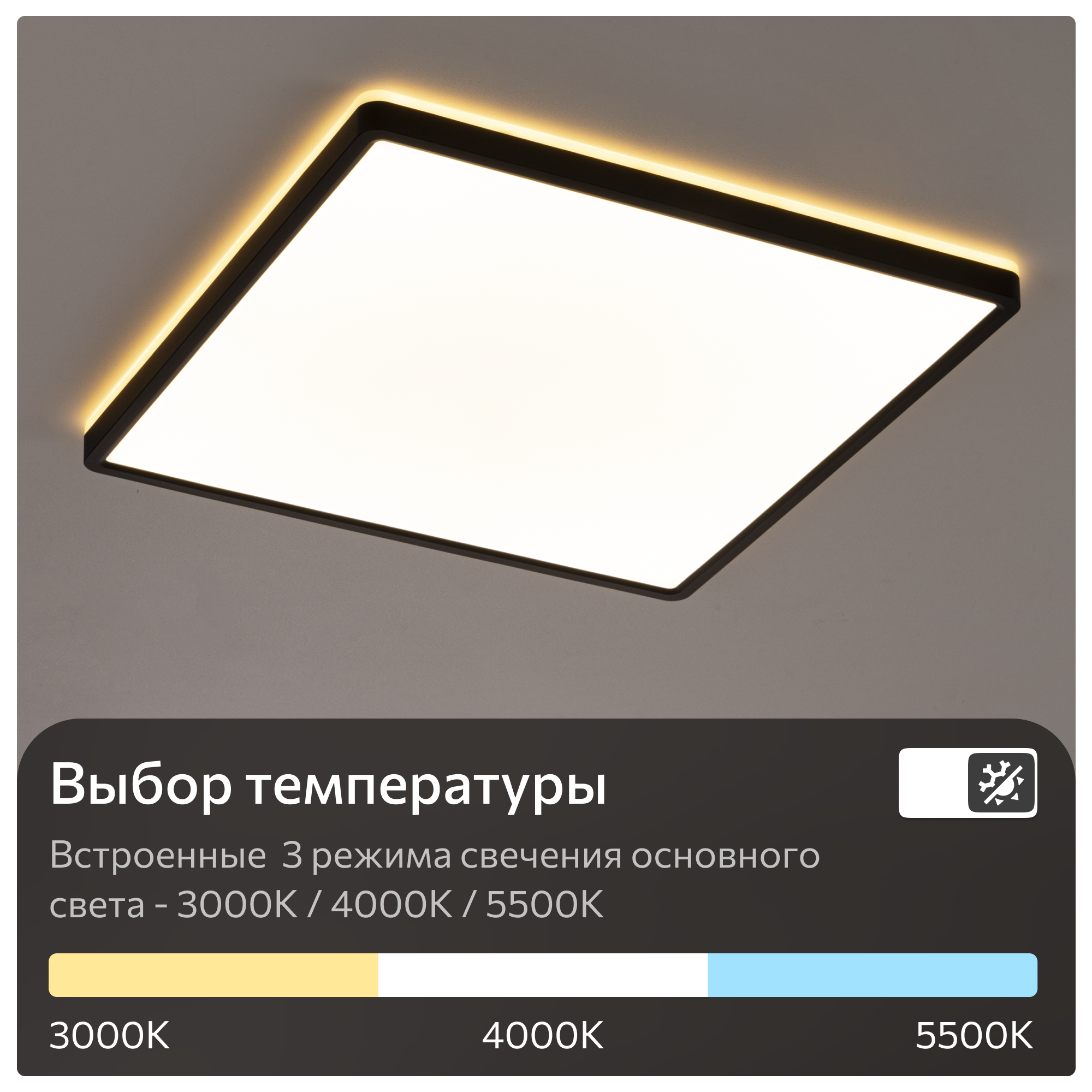 | Дополнительные характеристики | оснащена двумя светодиодными модулями – основного света и потолочной подсветки; есть возможность выбора цветовой температуры основного света - 3000К-4000К-5500К и уровня яркости потолочной подсветки – 100-40-20%,; цветовая температура потолочной подсветки фиксированная – 3000К |
