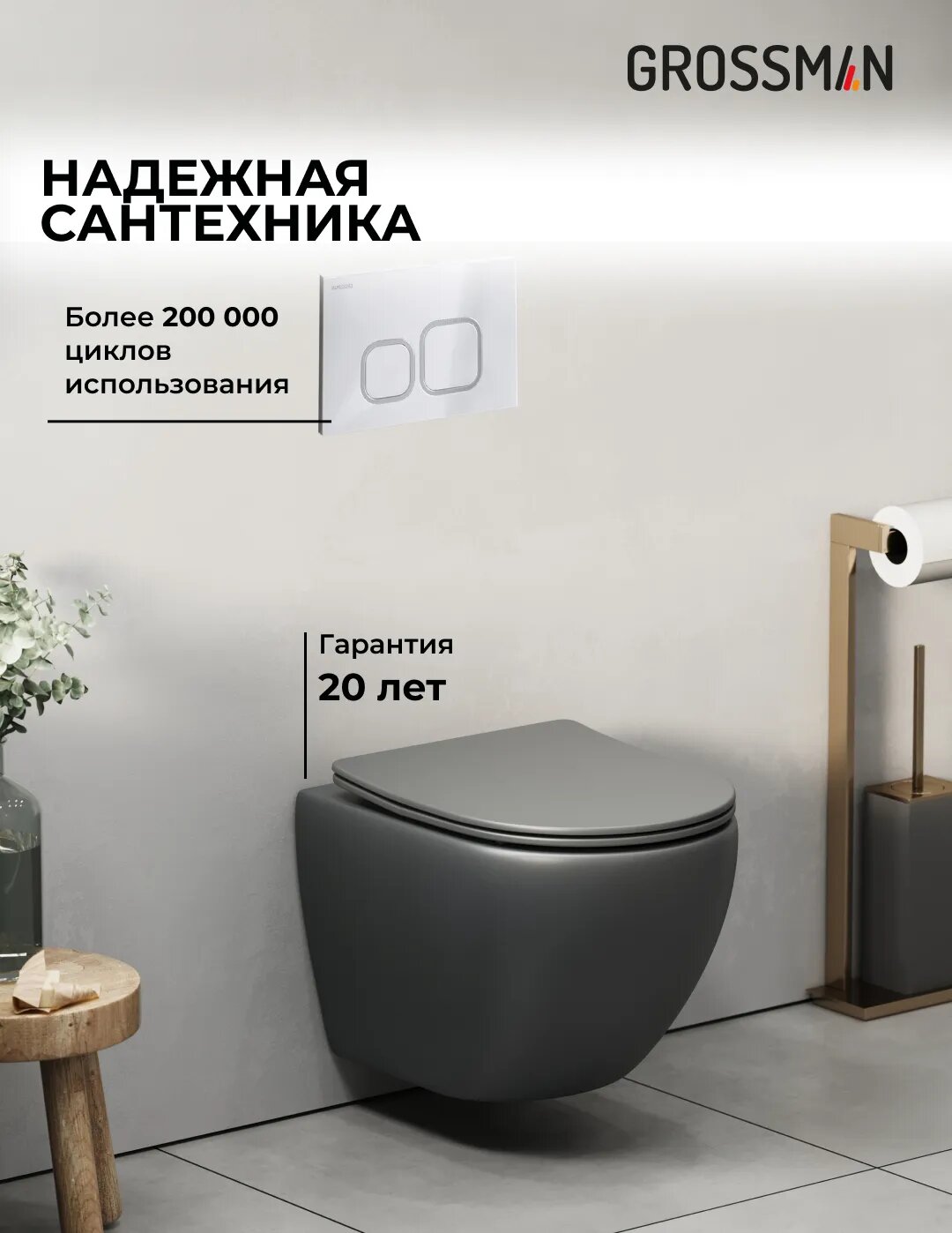 Комплект Унитаз подвесной с инсталляцией Grossman Cosmo 97.4455GMS.02.000 безободковый, серый матовый+ Кнопка смыва белая