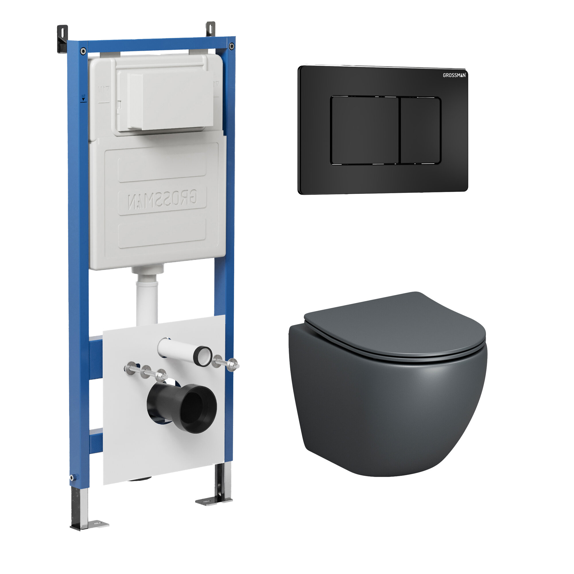 Комплект Унитаз подвесной с инсталляцией Grossman Classic 97.4455GMS.04.21M безободковый, серый матовый+ Кнопка смыва черная матовая