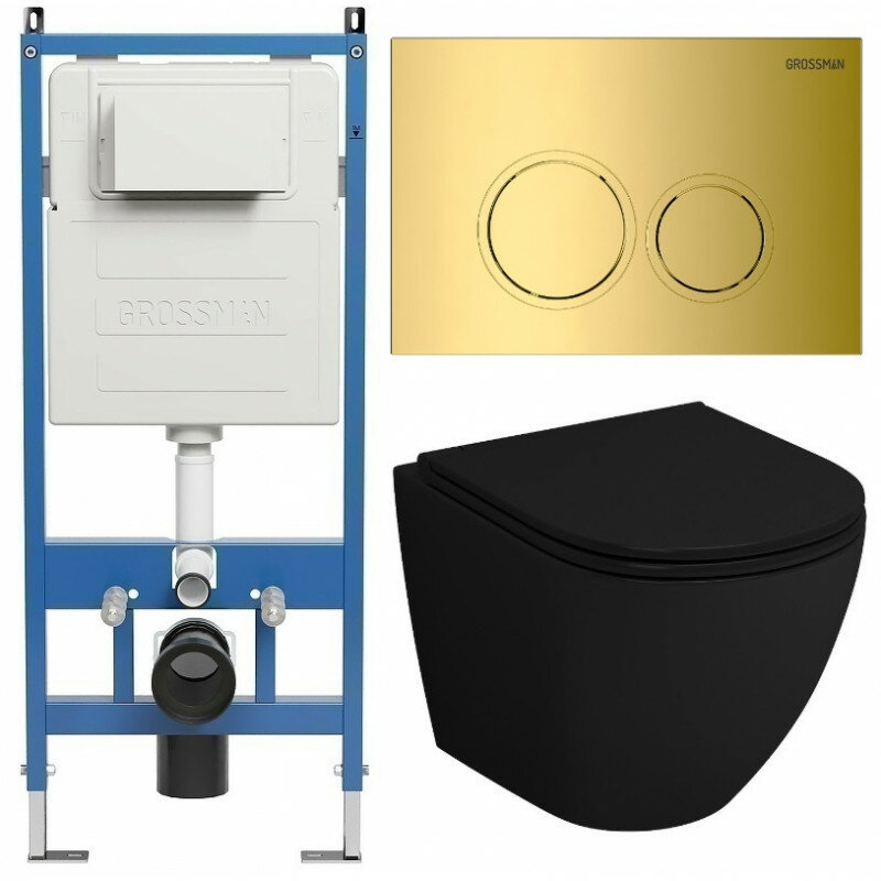 Комплект Унитаз подвесной с инсталляцией Grossman Galaxy 97.4455BMSQ.01.300 безободковый, черный матовый+ Кнопка смыва золото глянцевое