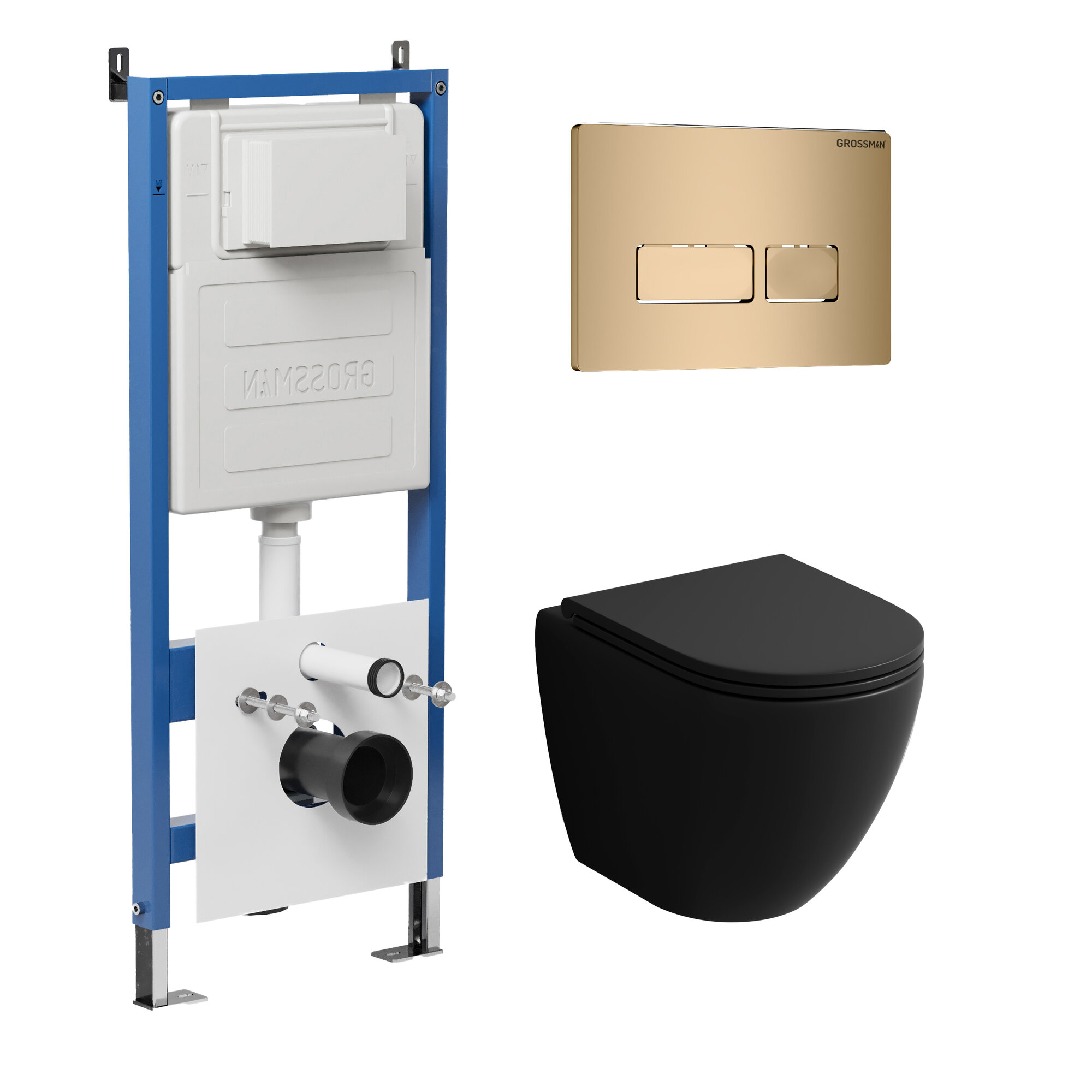 Комплект Унитаз подвесной с инсталляцией Grossman Pragma 97.4455BMSQ.03.310 безободковый, черный матовый+ Кнопка смыва золото матовое