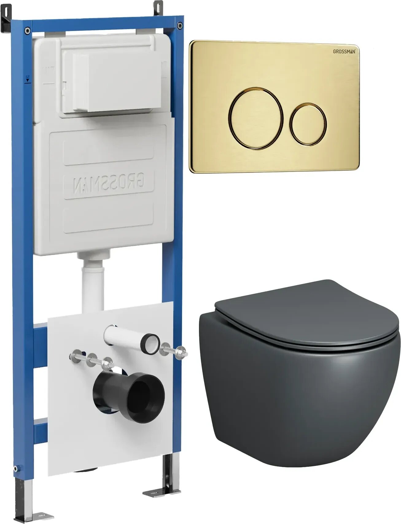 Комплект Унитаз подвесной с инсталляцией Grossman Style 97.4455GMS.05.32M безободковый, серый матовый+ Кнопка смыва золото сатиновое