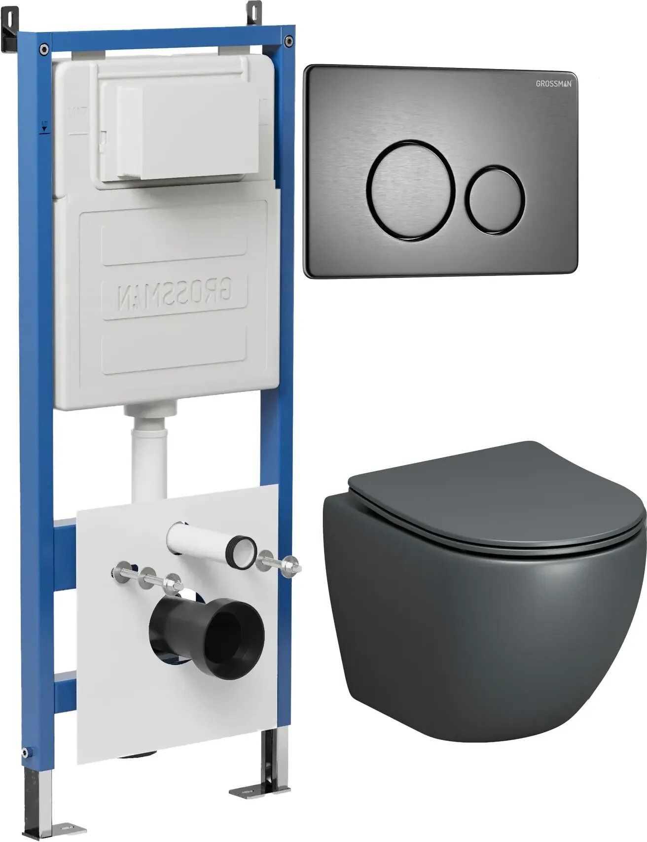 Комплект Унитаз подвесной с инсталляцией Grossman Style 97.4455GMS.05.42M безободковый, серый матовый+ Кнопка смыва графит сатиновый