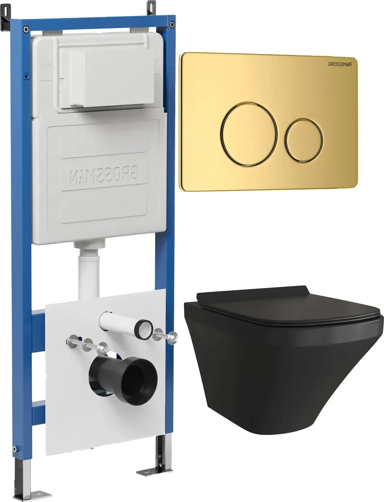 Комплект Унитаз подвесной с инсталляцией Grossman Style 97.4440BMS.05.30M безободковый, черный матовый+ Кнопка смыва золото глянцевое