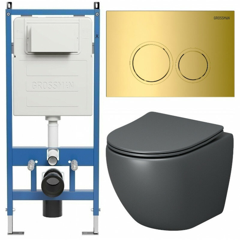 Комплект Унитаз подвесной с инсталляцией Grossman Galaxy 97.4455GMS.01.300 безободковый, серый матовый+ Кнопка смыва золото глянцевое