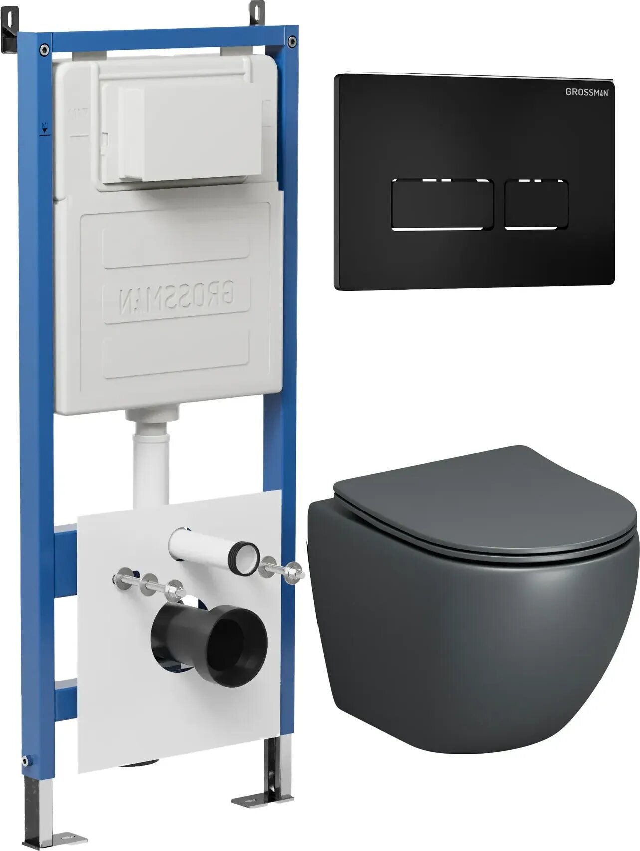 Комплект Унитаз подвесной с инсталляцией Grossman Pragma 97.4455GMS.03.210 безободковый, серый матовый+ Кнопка смыва черная матовая