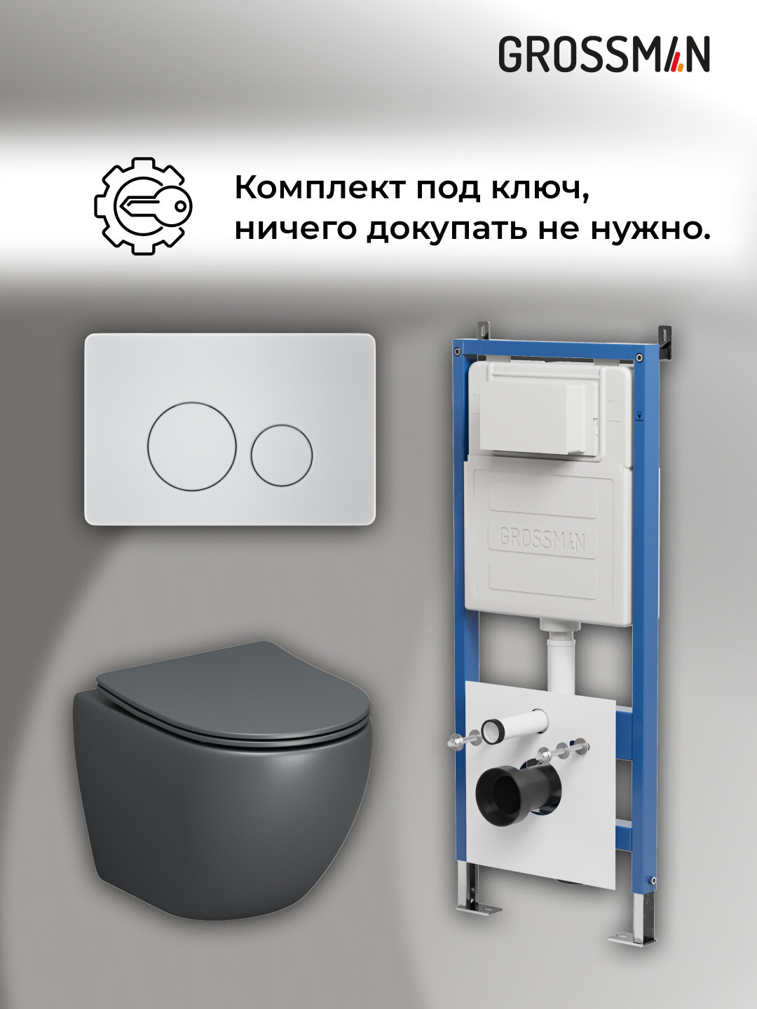 Комплект Унитаз подвесной с инсталляцией Grossman Style 97.4455GMS.05.01M безободковый, серый матовый+ Кнопка смыва белая матовая