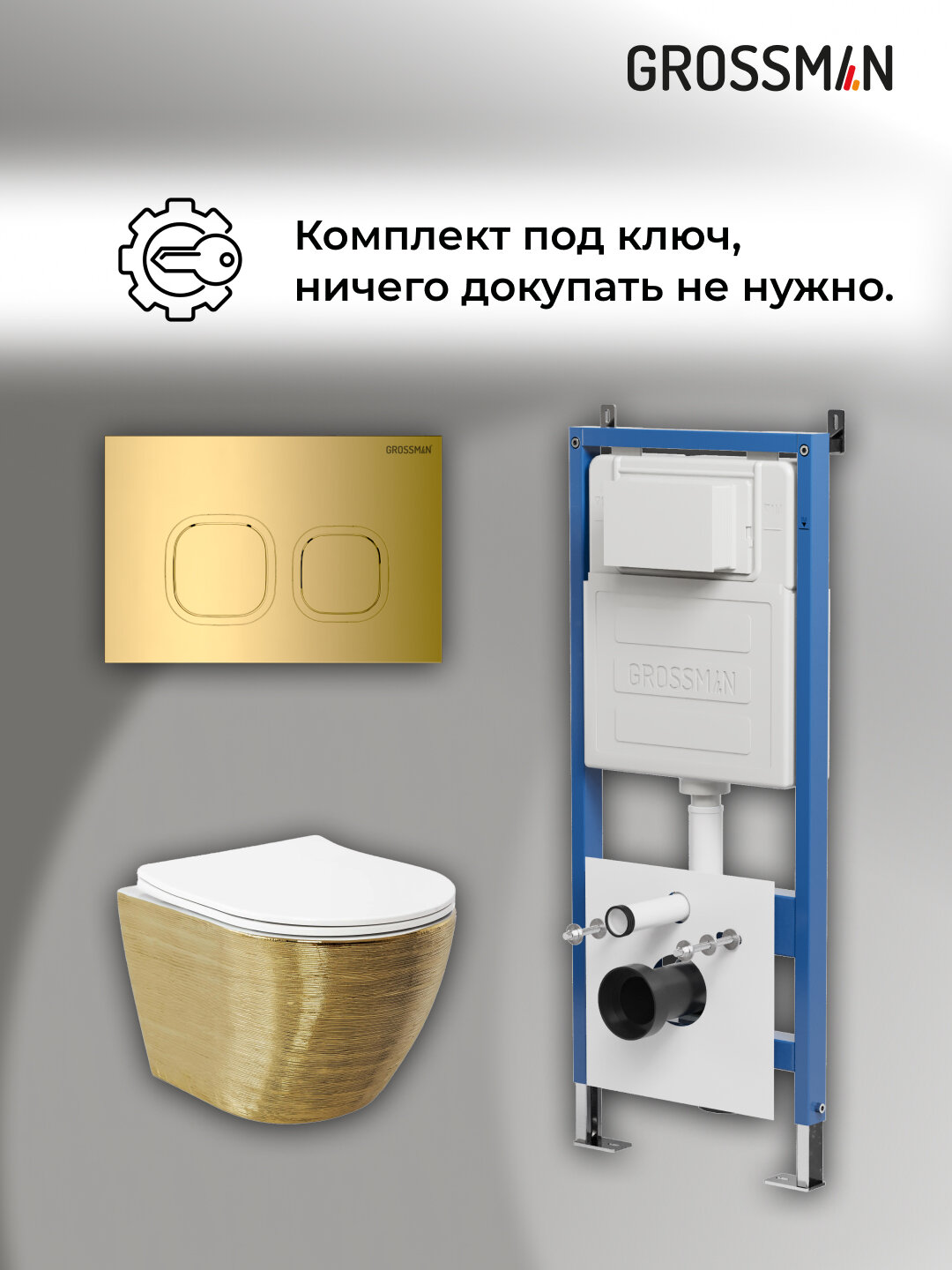 Комплект Унитаз подвесной с инсталляцией Grossman Cosmo 97.4455GWS.02.300 безободковый, золото+ Кнопка смыва золото глянцевое
