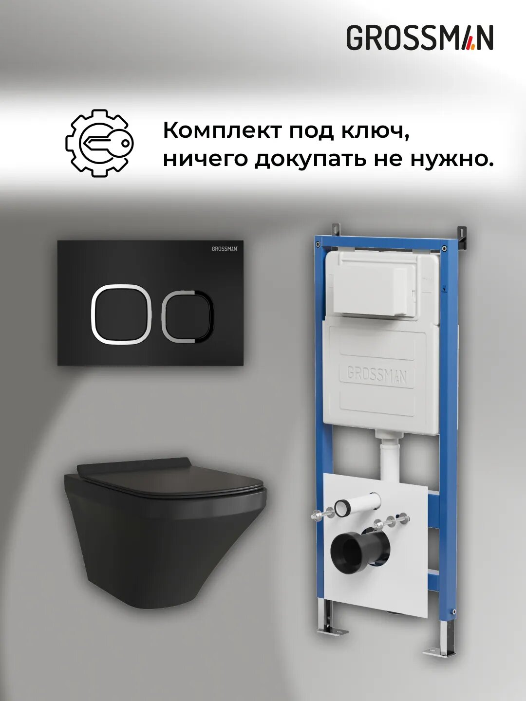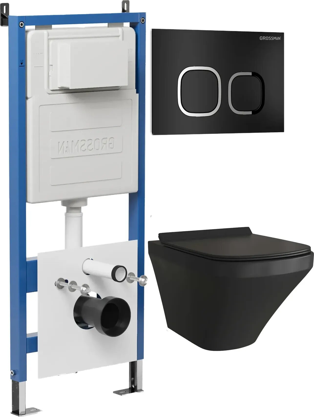 Комплект Унитаз подвесной с инсталляцией Grossman Cosmo 97.4440BMS.02.210 безободковый, черный матовый+ Кнопка смыва черная матовая