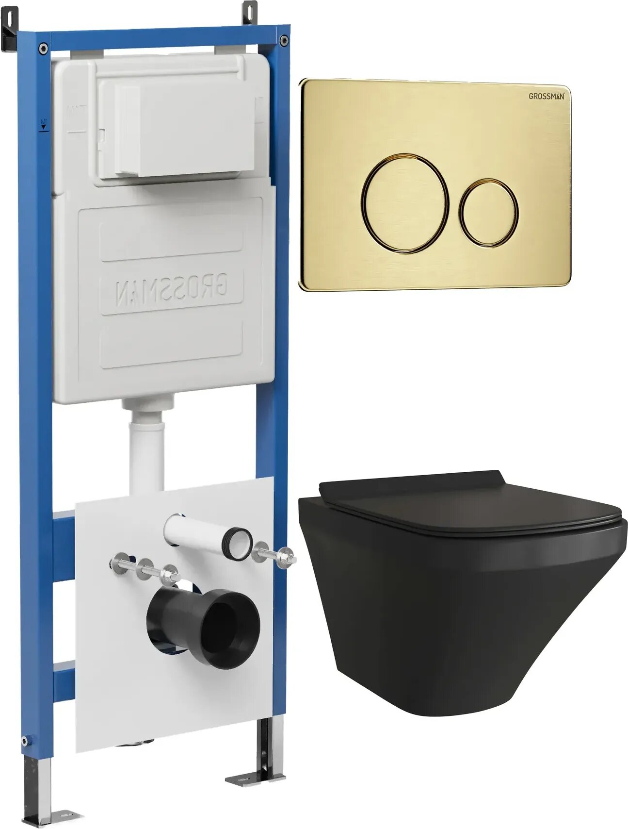 Комплект Унитаз подвесной с инсталляцией Grossman Style 97.4440BMS.05.32M безободковый, черный матовый+ Кнопка смыва золото сатиновое