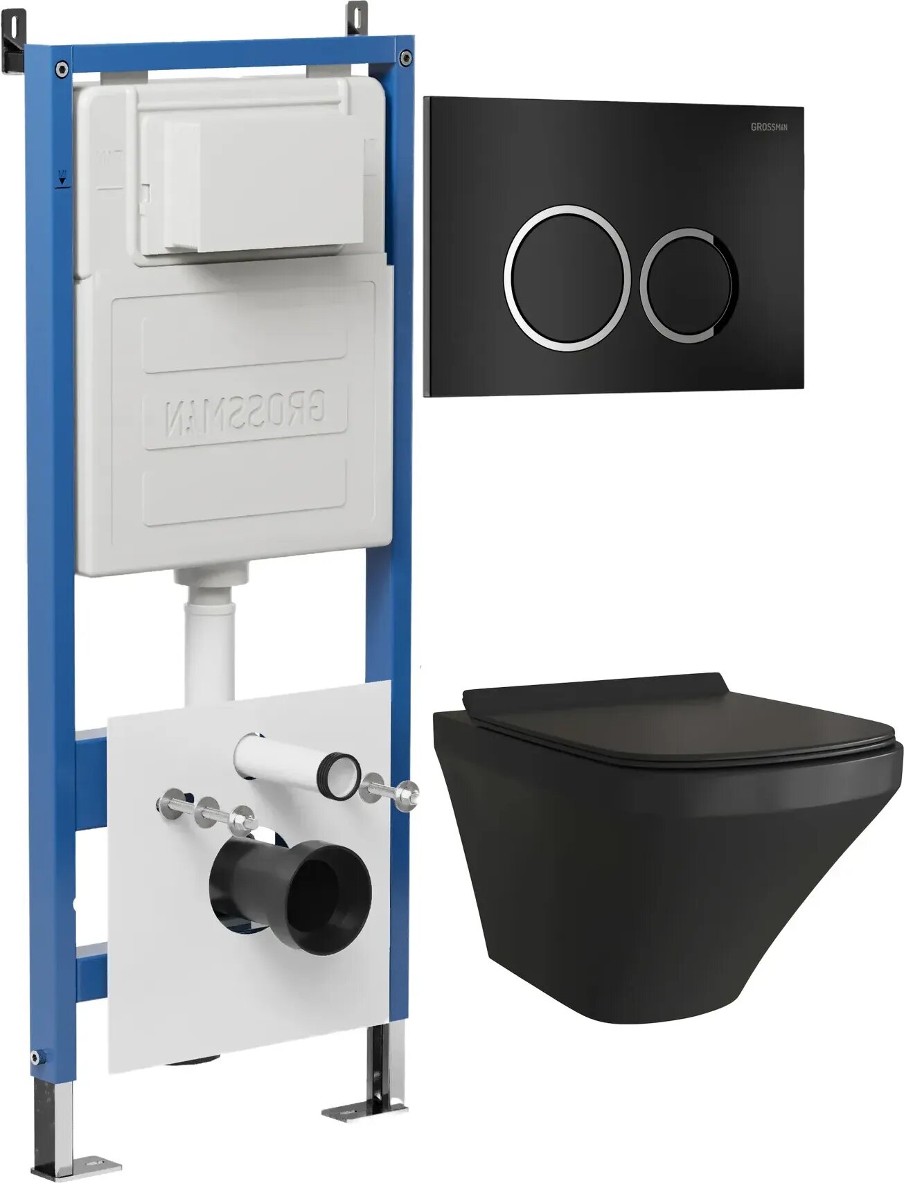 Комплект Унитаз подвесной с инсталляцией Grossman Galaxy 97.4440BMS.01.210 безободковый, черный матовый+ Кнопка смыва черная матовая