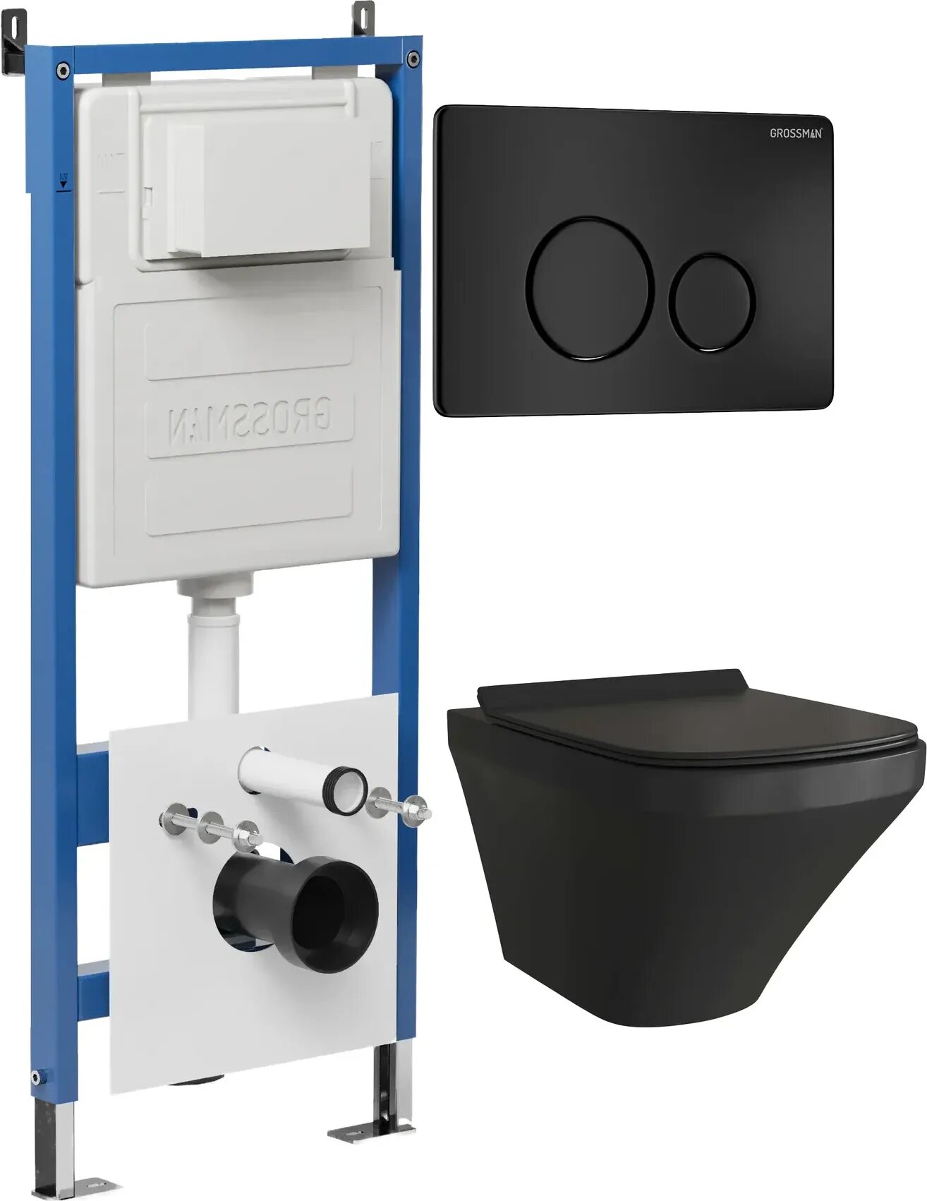 Комплект Унитаз подвесной с инсталляцией Grossman Style 97.4440BMS.05.21M безободковый, черный матовый+ Кнопка смыва черная матовая