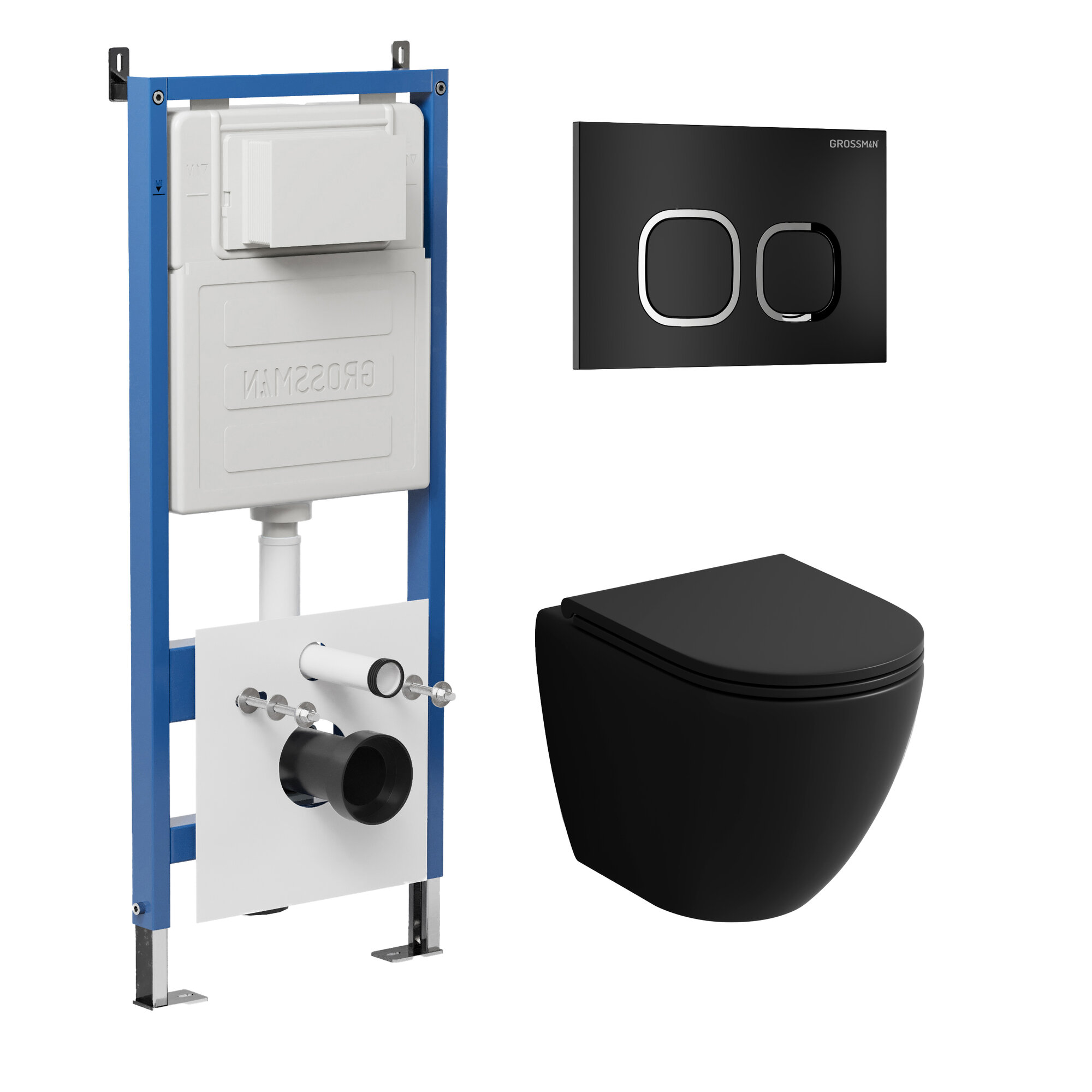 Комплект Унитаз подвесной с инсталляцией Grossman Cosmo 97.4455BMSQ.02.210 безободковый, черный матовый+ Кнопка смыва черная матовая