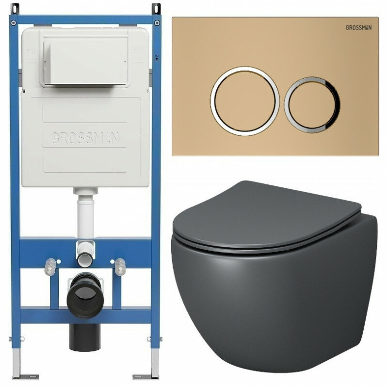 Комплект Унитаз подвесной с инсталляцией Grossman Galaxy 97.4455GMS.01.310 безободковый, серый матовый+ Кнопка смыва золото матовое
