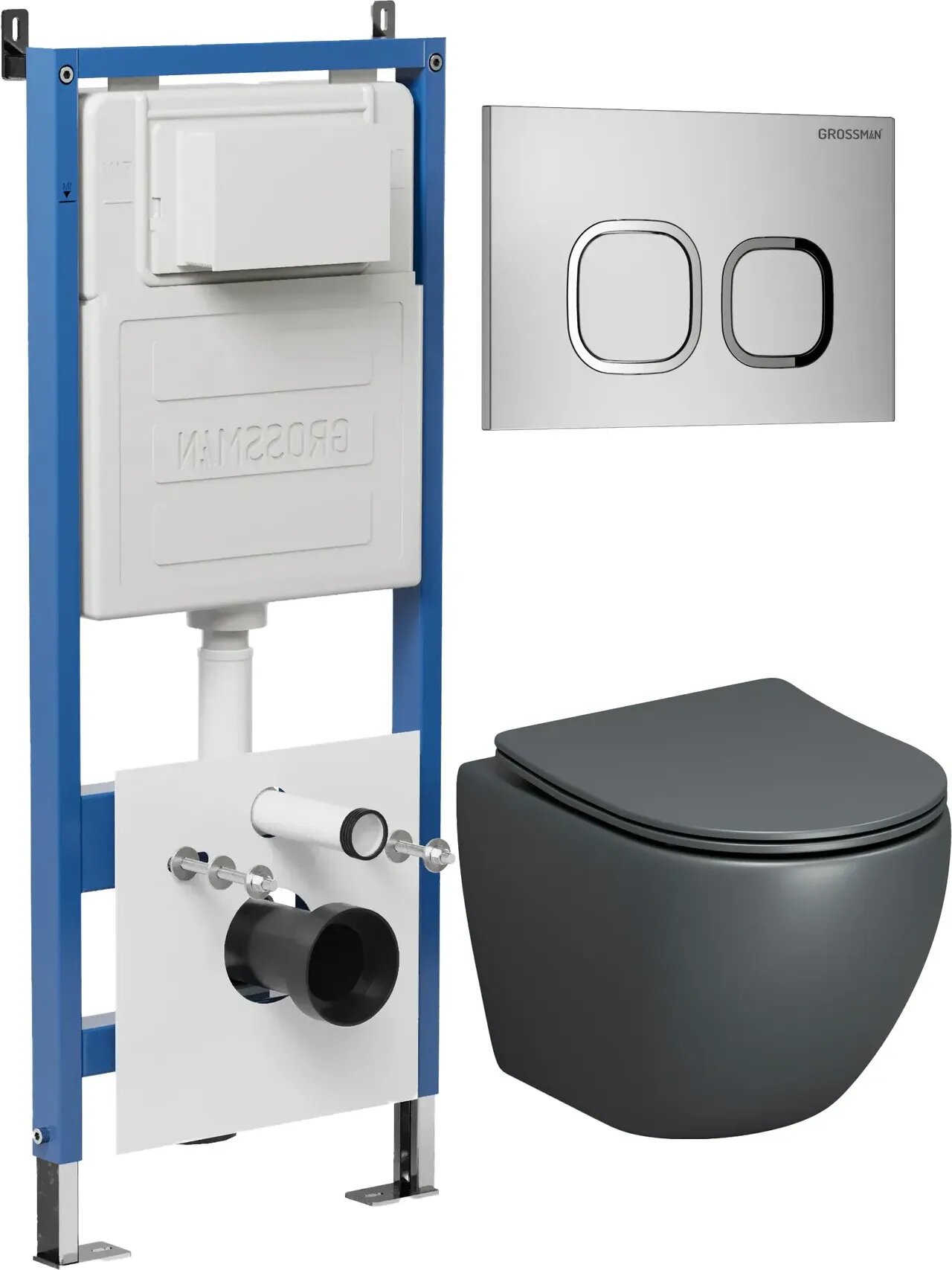 Комплект Унитаз подвесной с инсталляцией Grossman Cosmo 97.4455GMS.02.110 безободковый, серый матовый+ Кнопка смыва хром матовый