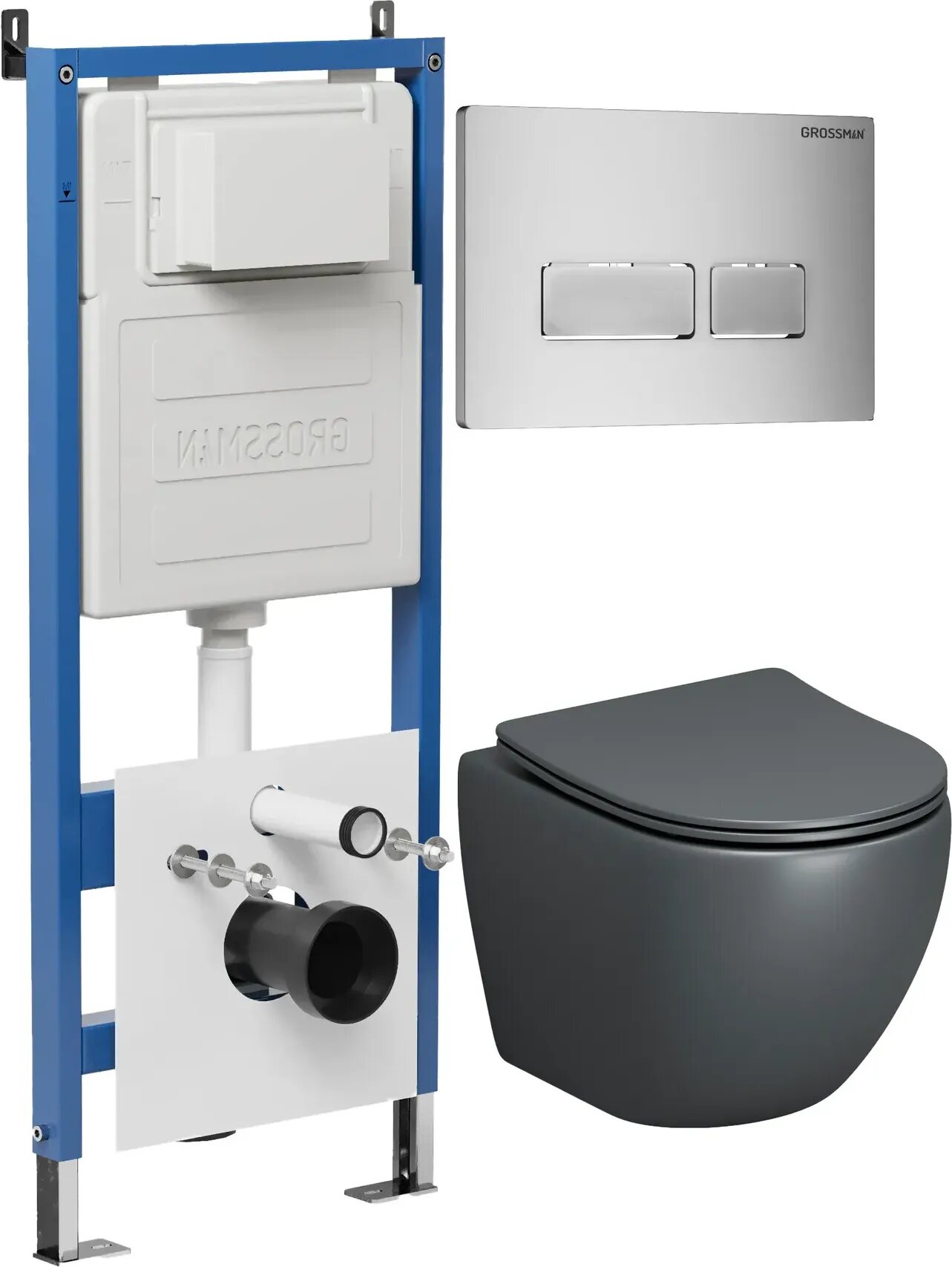 Комплект Унитаз подвесной с инсталляцией Grossman Pragma 97.4455GMS.03.110 безободковый, серый матовый+ Кнопка смыва хром матовый