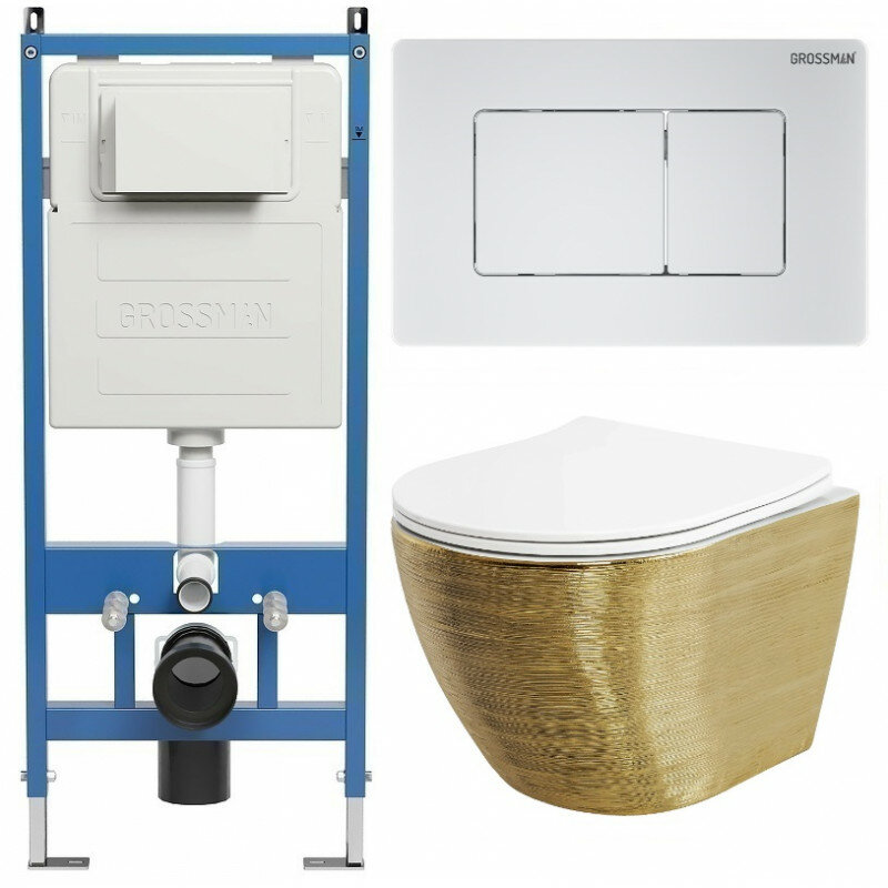 Комплект Унитаз подвесной с инсталляцией Grossman Classic 97.4455GWS.04.01M безободковый, золото+ Кнопка смыва белая матовая