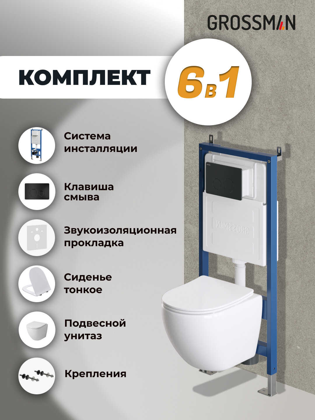 Комплект Унитаз подвесной с инсталляцией Grossman Style 97.4455SQ.05.21M безободковый, белый+ Кнопка смыва черная матовая
