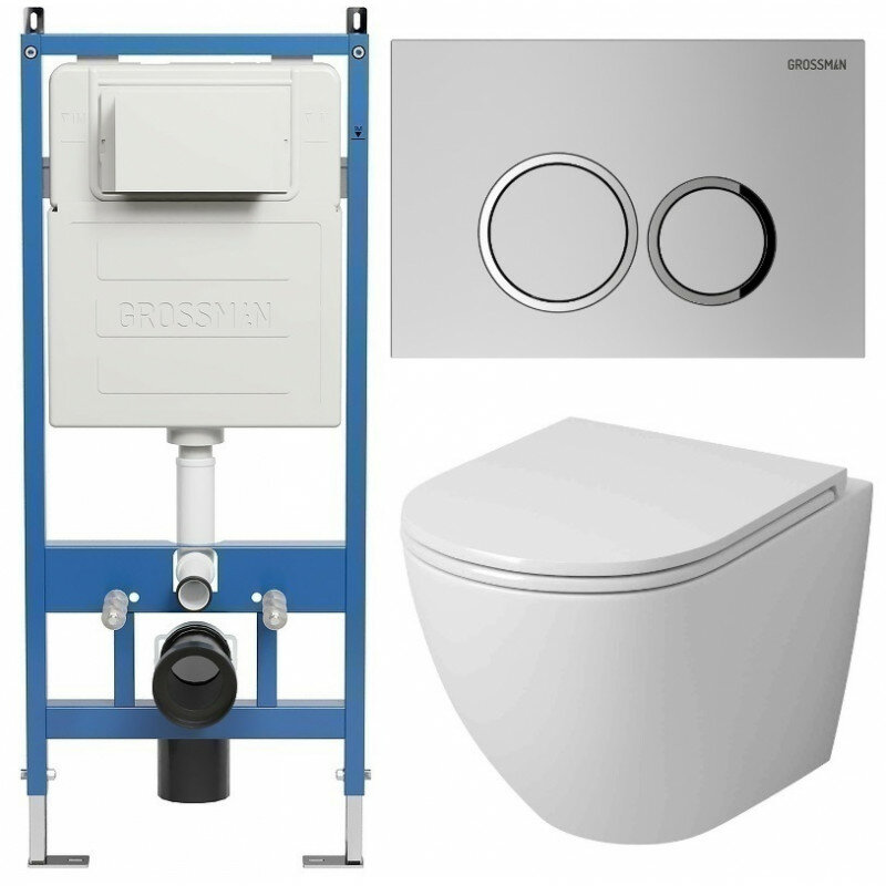 Комплект Унитаз подвесной с инсталляцией Grossman Galaxy 97.4455SQ.01.110 безободковый, белый+ Кнопка смыва хром матовый