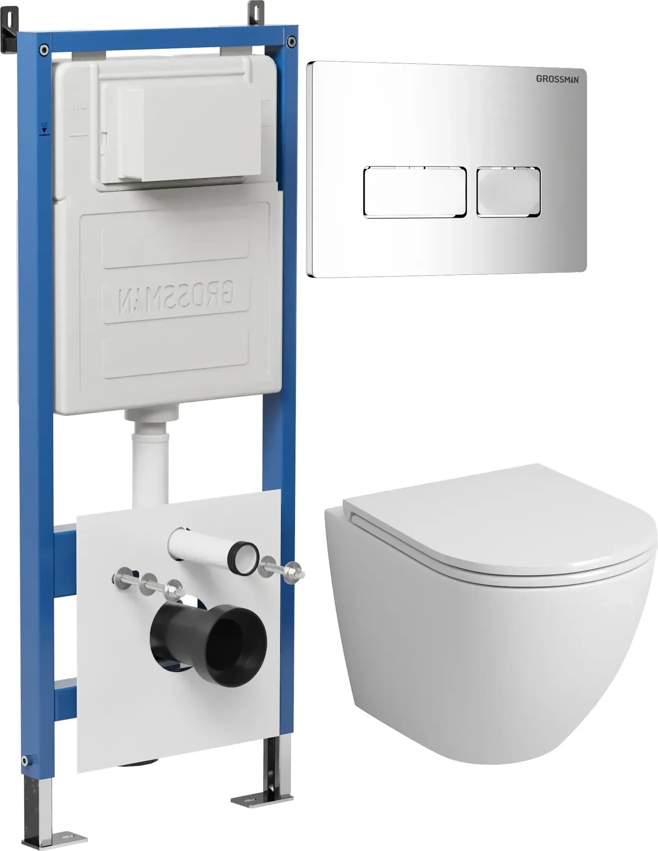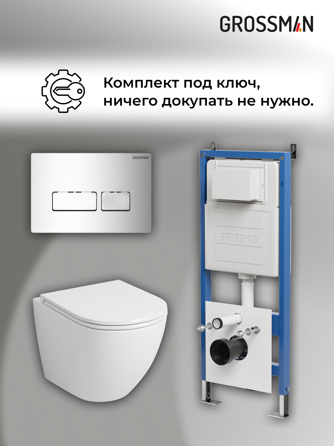 Комплект Унитаз подвесной с инсталляцией Grossman Pragma 97.4455SQ.03.100 безободковый, белый+ Кнопка смыва хром глянцевый