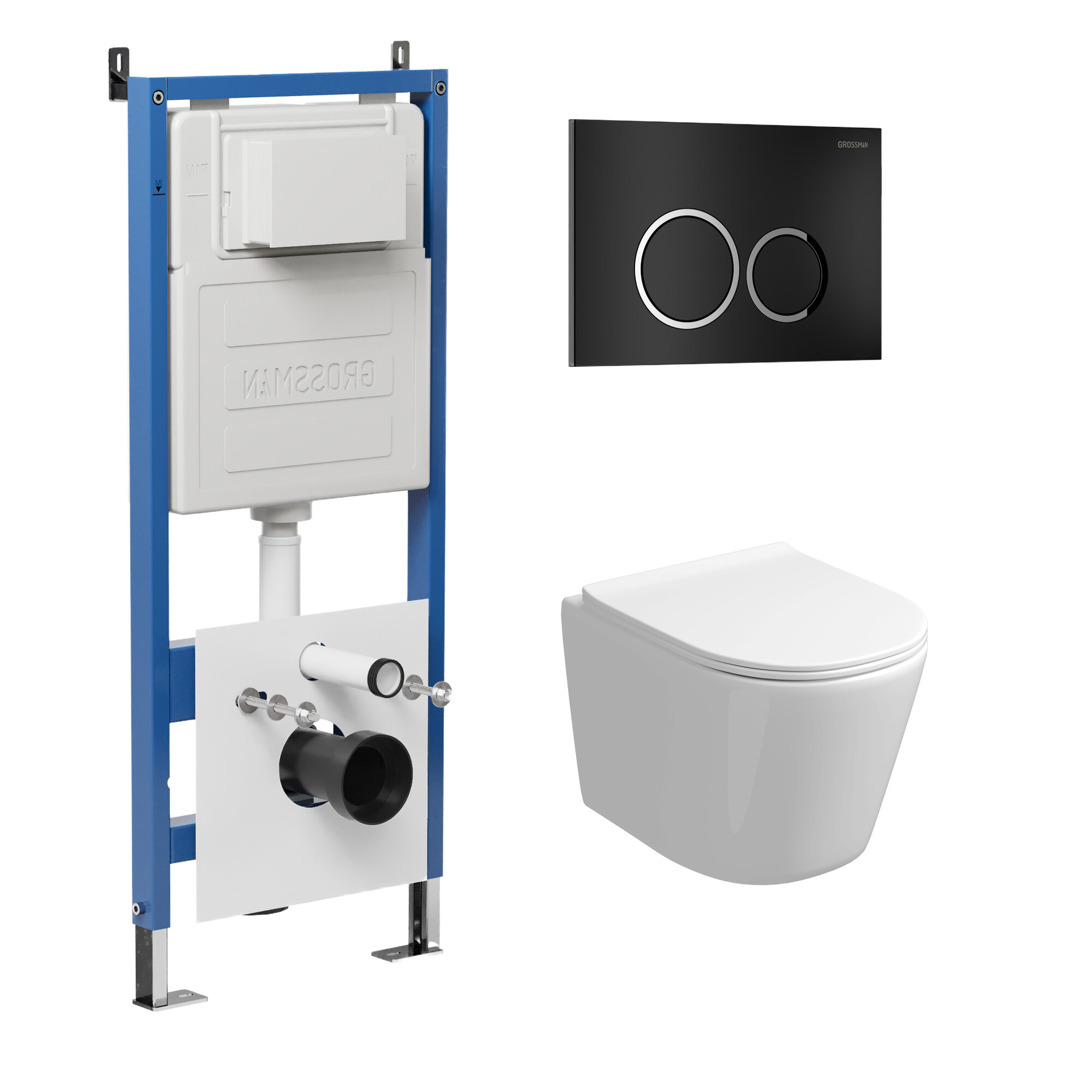 Комплект Унитаз подвесной с инсталляцией Grossman Galaxy 97.4477SQ.01.210 безободковый, белый+ Кнопка смыва черная матовая