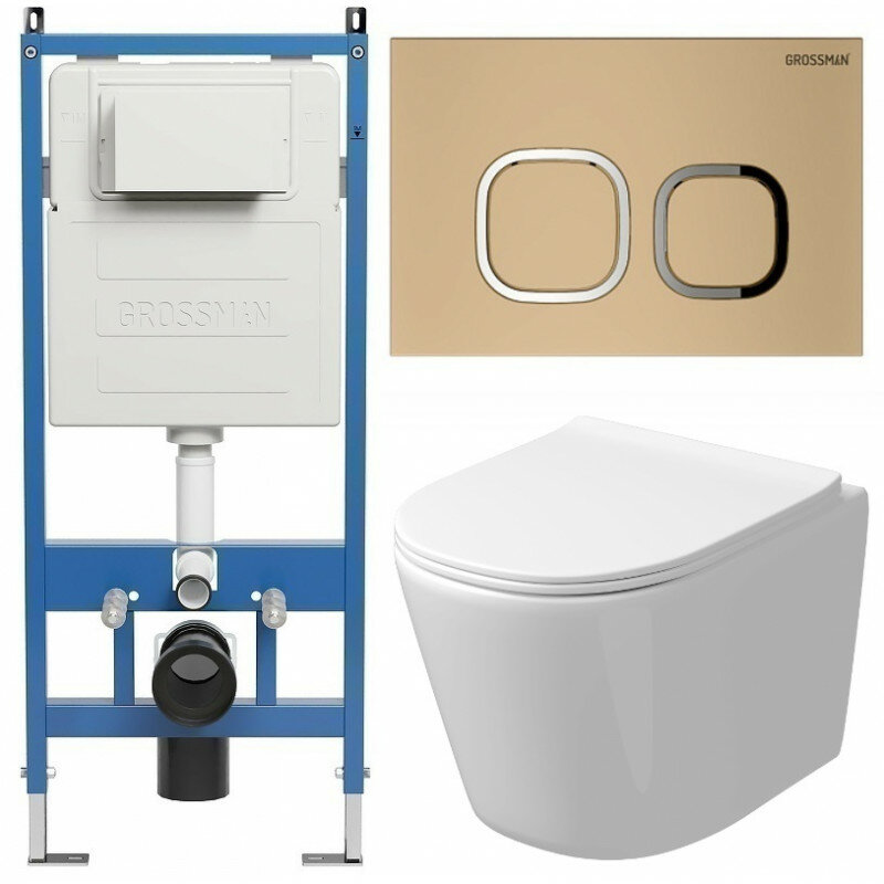 Комплект Унитаз подвесной с инсталляцией Grossman Cosmo 97.4477SQ.02.310 безободковый, белый+ Кнопка смыва золото матовое