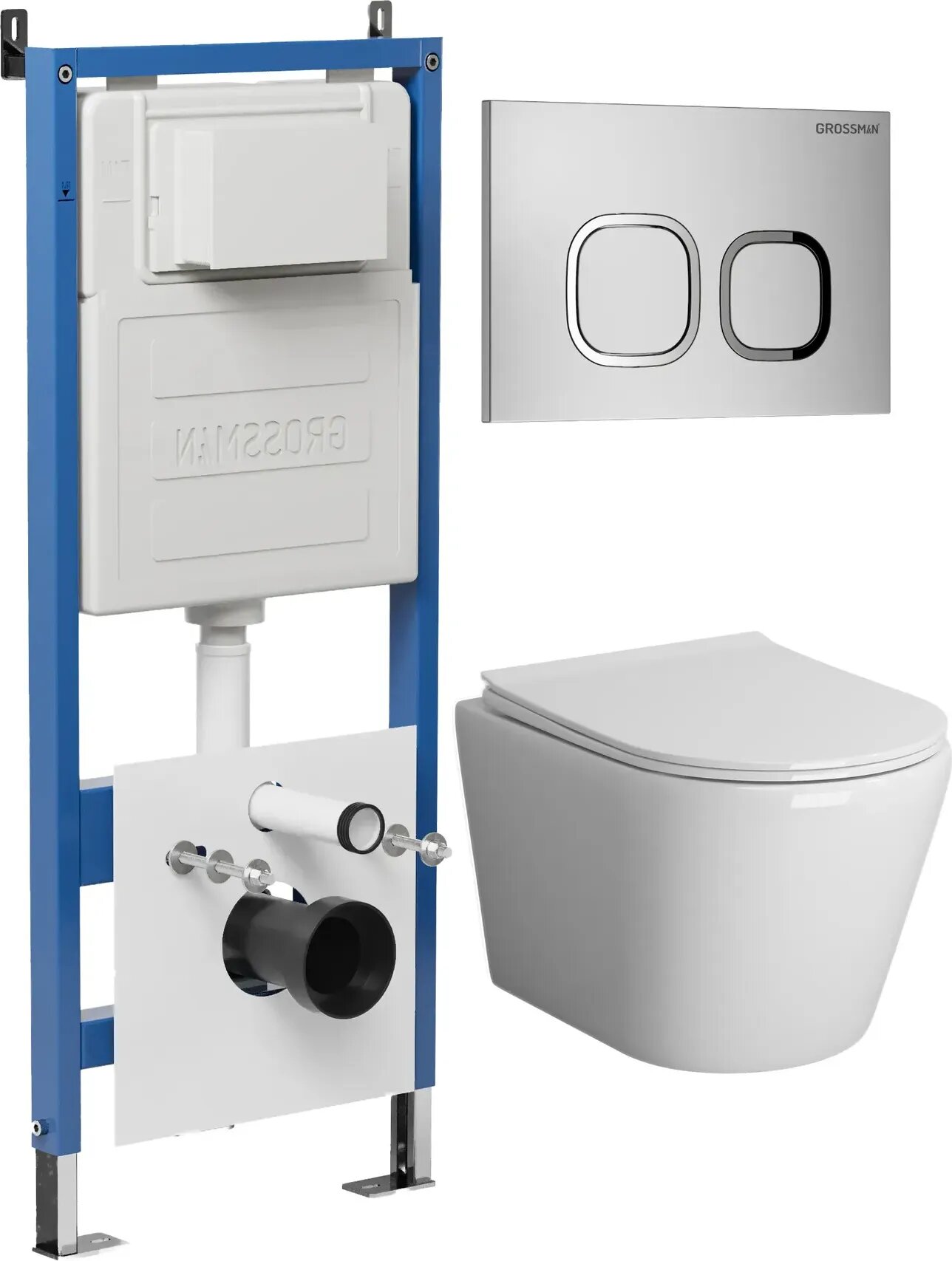 Комплект Унитаз подвесной с инсталляцией Grossman Cosmo 97.4478SQ.02.110 безободковый, белый+ Кнопка смыва хром матовый