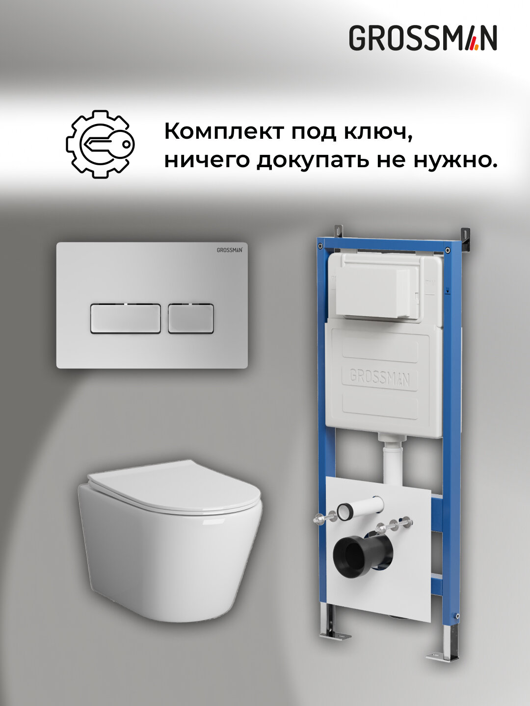 Комплект Унитаз подвесной с инсталляцией Grossman Pragma 97.4479SQ.03.110 безободковый, белый+ Кнопка смыва хром матовый