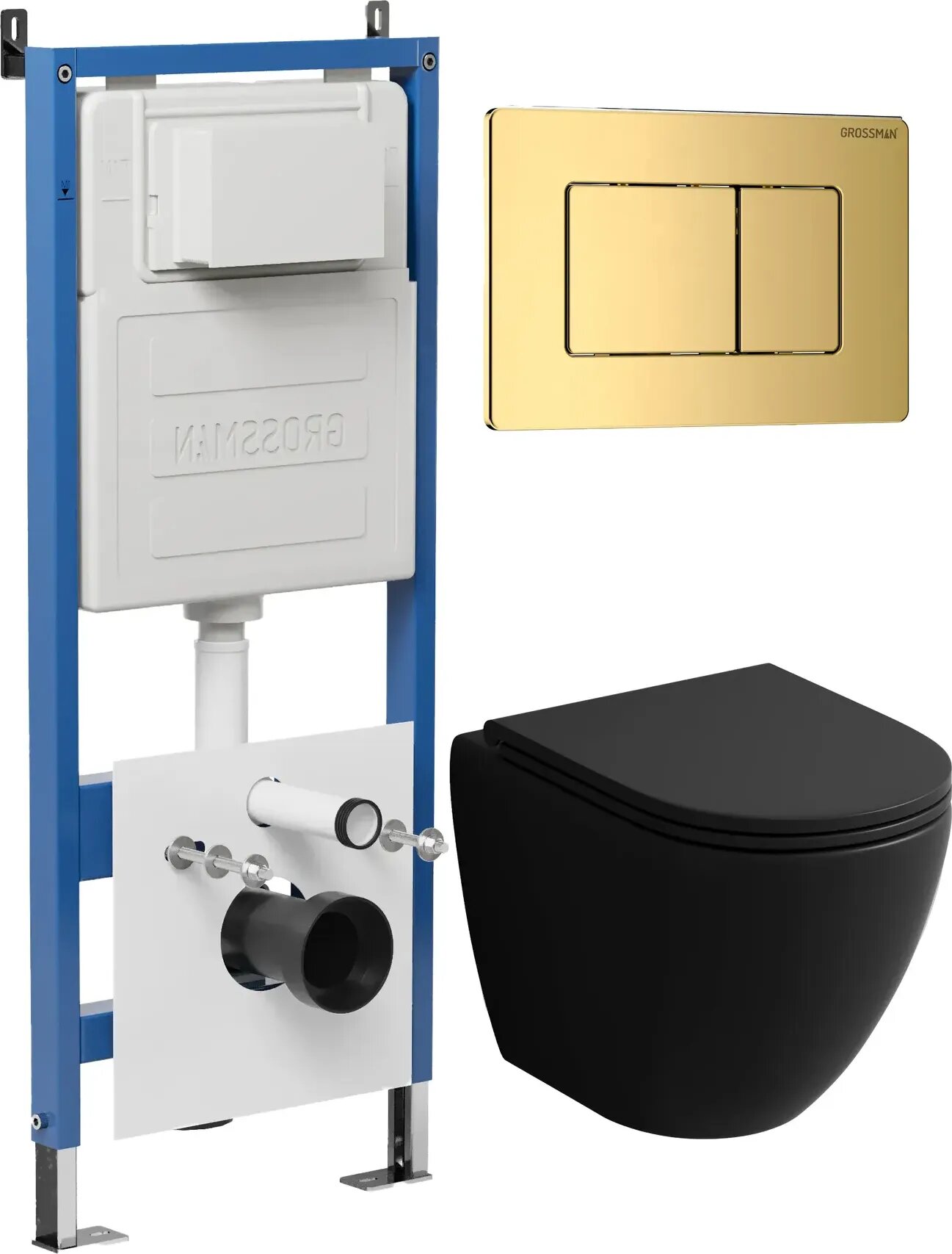 Комплект Унитаз подвесной с инсталляцией Grossman Classic 97.4455BMS.04.30M безободковый, черный матовый+ Кнопка смыва золото глянцевое