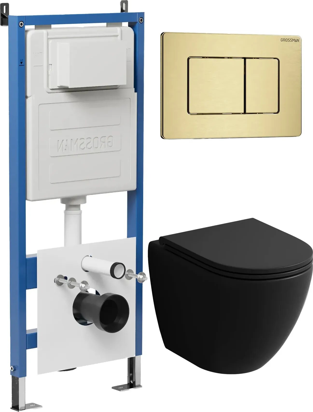 Комплект Унитаз подвесной с инсталляцией Grossman Classic 97.4455BMS.04.32M безободковый, черный матовый+ Кнопка смыва золото сатиновое