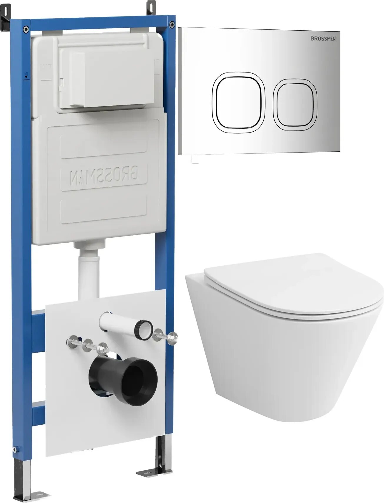 Комплект Унитаз подвесной с инсталляцией Grossman Cosmo 97.4477SQ.02.100 безободковый, белый+ Кнопка смыва хром глянцевый