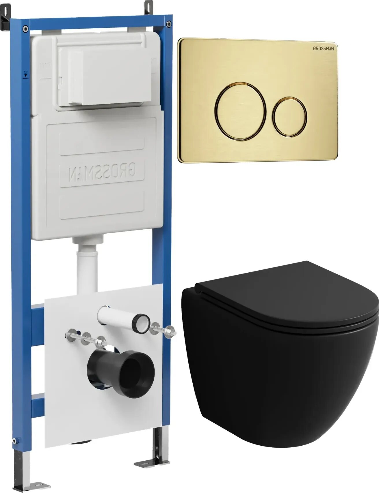 Комплект Унитаз подвесной с инсталляцией Grossman Style 97.4455BMS.05.32M безободковый, черный матовый+ Кнопка смыва золото сатиновое