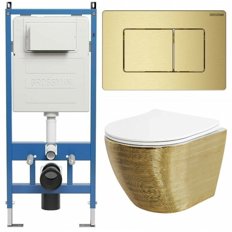 Комплект Унитаз подвесной с инсталляцией Grossman Classic 97.4455GWS.04.32M безободковый, золото+ Кнопка смыва золото сатиновое