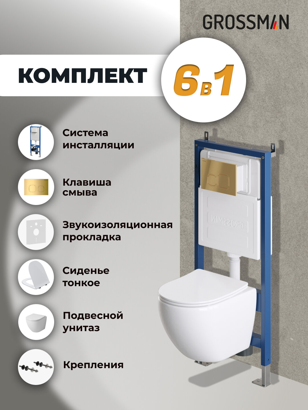 Комплект Унитаз подвесной с инсталляцией Grossman Cosmo 97.4455SQ.02.300 безободковый, белый+ Кнопка смыва золото глянцевое
